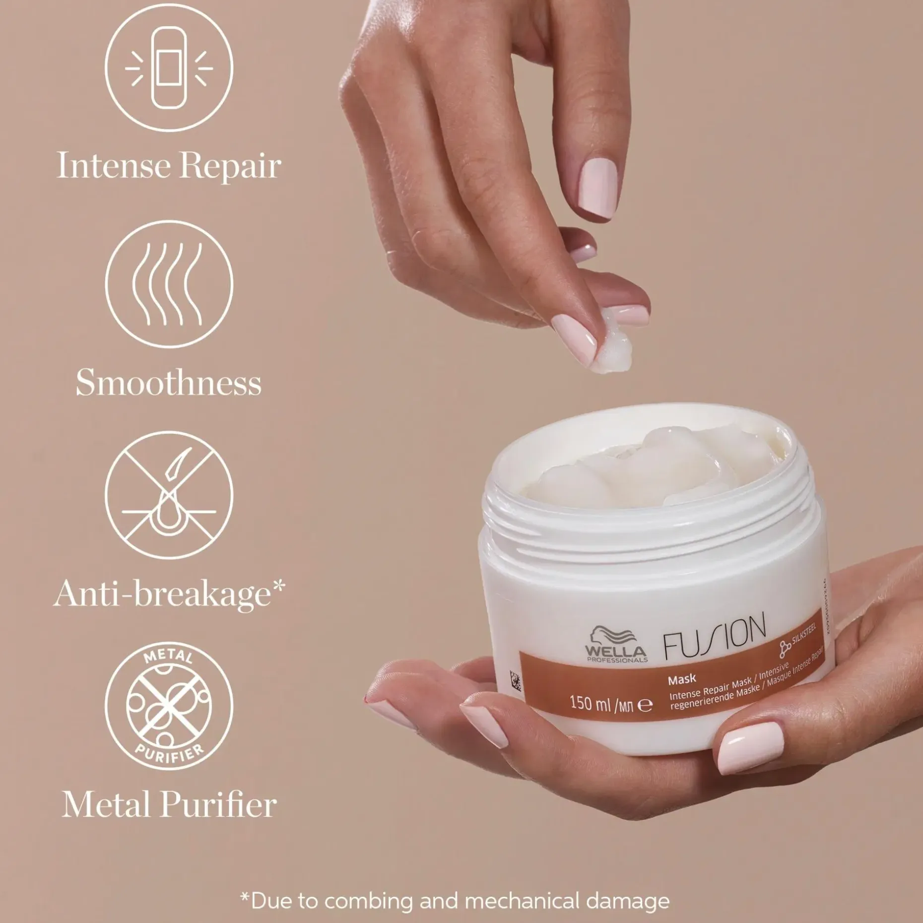 Wella Professionals Fusion Intense Repair Mask ehkäisee hiusten katkeilua ja on kehitetty erityisesti vaurioituneiden hiusten hoitoon. Hiusnaamio hoitaa vaurioituneita hiuksia ja suojaa niitä mekaanisilta vaurioilta ja hiusten katkeilulta kampaamisen aikana. Sisältää silkkiaminohappoja ja tehokkaita hoitavia ainesosia, jotka syvähoitavat hiuksia ja tekevät niistä vastustuskykyisemmät. Saatavana kolme kokoa: 30 ml, 150 ml ja 500 ml.