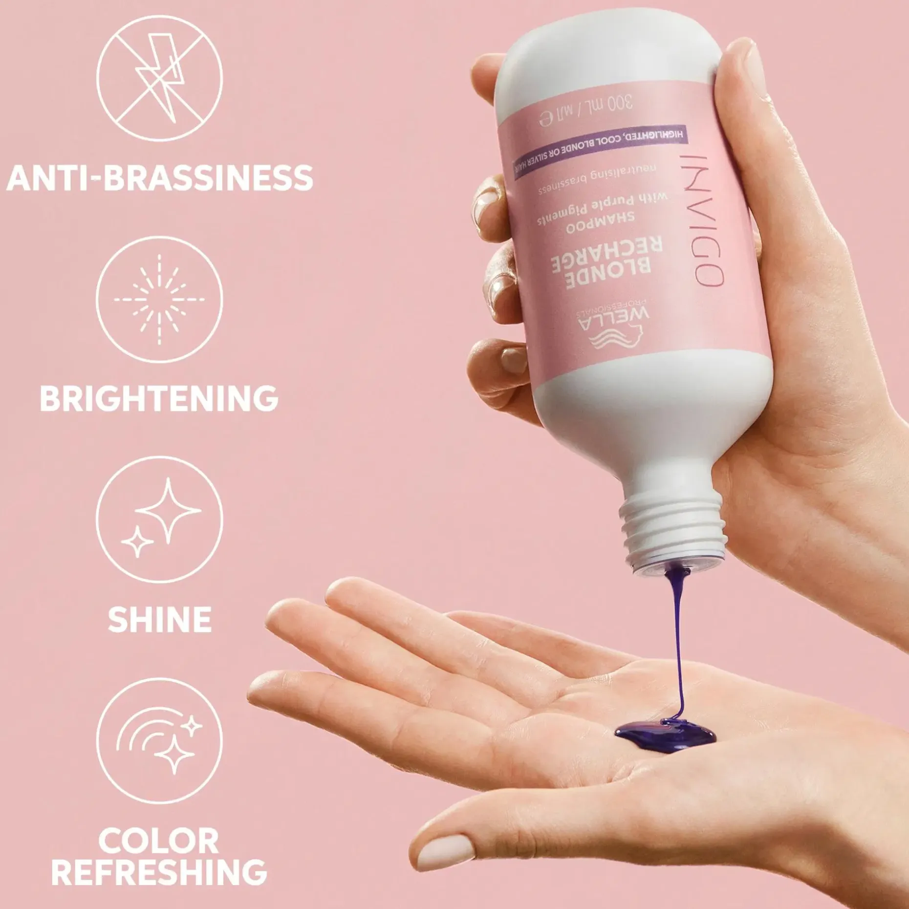 Virkistää ja säilyttää luonnollisen tai vaalennetun vaalean hiuksen kirkkautta ja loistoa. Tämä violetti shampoo estää luonnollisen tai vaalennetun vaalean hiuksen kellastumista ja auttaa estämään samentumista, jättäen hiukset pehmeäksi koskettaa.