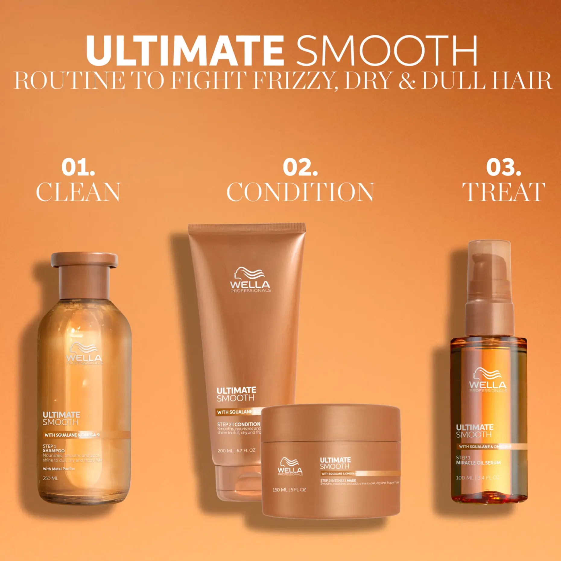 Wella Professionals Ultimate Smooth Shampoo on kehitetty Metal Purifier -teknologialla puhdistamaan hiuksistasi metallit. Miracle Oil Serumia käytettäessä hiukset ravitaan 30 sekunnissa ja sileänä, joka kestää jopa 3 päivää*. Sisältää skvalaania ja omega-9-rasvahappoja syväravitsemaan hiuksia sisältä ja täydentämään hiuksia ulkopuolelta – dermatologisesti testattu ja sopii värjätyille hiuksille. Se sisältää sekoituksen jasmiinin, vaniljan, bergamotin, persikan ja santelipuun vivahteita – nauti kukkakimpun tuoksusta jokaisella käyttökerralla. Levitä Ultimate Smooth shampoo kosteisiin hiuksiin ja vaahdota. Huuhtele ja toista tarvittaessa. Tämä shampoo puhdistaa hellävaraisesti ja tehokkaasti ylellisen vaahdon avulla. Saat parhaat tulokset käyttämällä tätä detox-shampoota Ultimate Smooth -hoitoaineen, hiusnaamion ja Miracle Oil -seerumin kanssa. Tämä hiushoito sopii ihanteellisesti itsehoitoon tai kauneuslahjaksi.