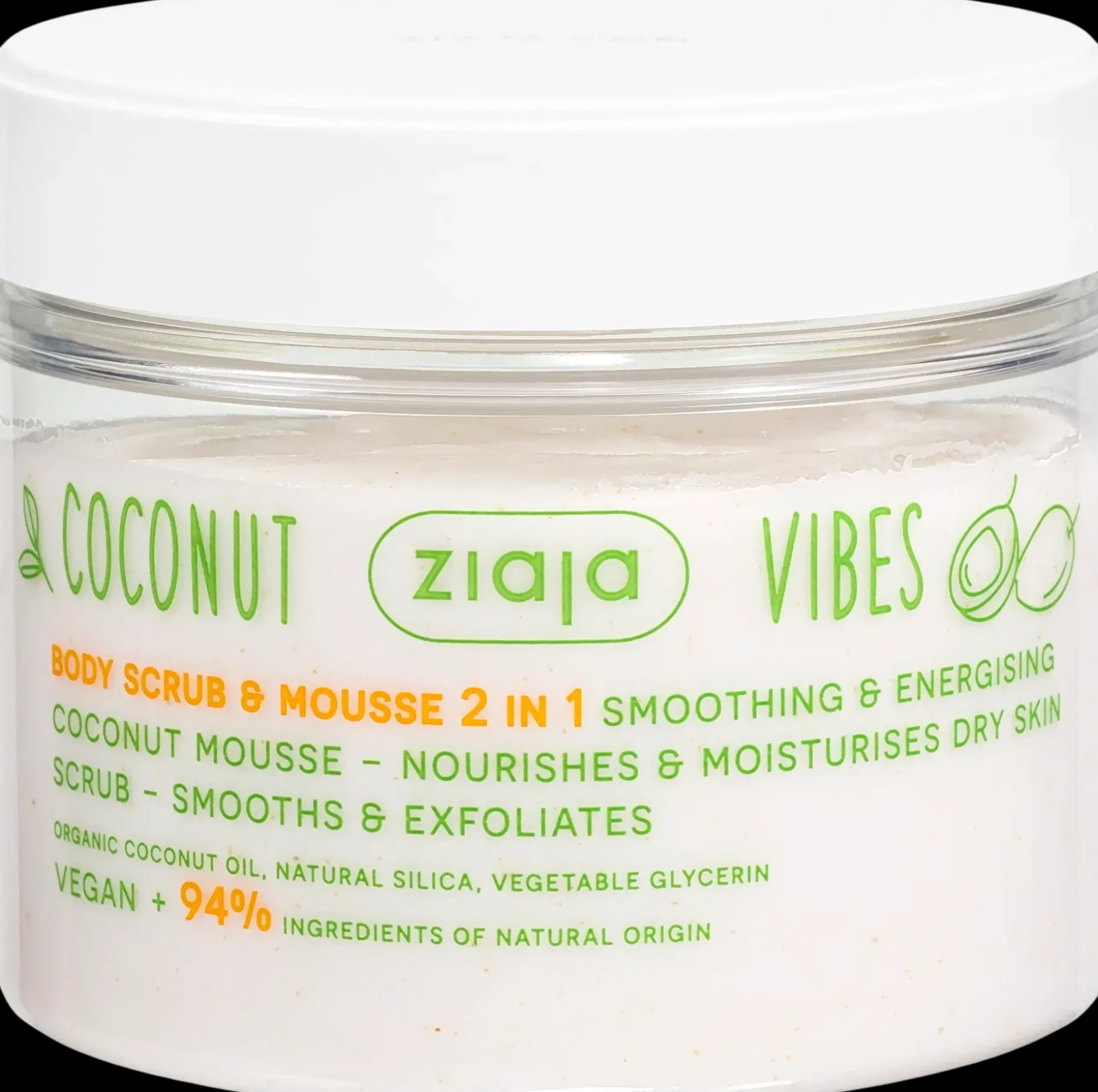 Ziaja coconut vibes 2in1 vartalokuorinta-vartalomousse kuorii ja samalla ravitsee vartalon ihoa. Kevyt, kuohkea koostumus. Sisältää ravitsevaa ja pehmentävää luomukookosöljyä, luonnollista kuorivaa piitä sekä kasviperäistä kosteuttavaa glyseriiniä. 94 % luonnolliset ainesosat. Sopii myös jokapäiväiseen käyttöön. Herkullinen kookostuoksu. Vegaaninen. Käyttö: Levitä vartalon iholle, anna vaikuttaa muutama minuutti. Hiero ihoa pyörivin liikkein. Huuhtele lämpimällä vedellä.