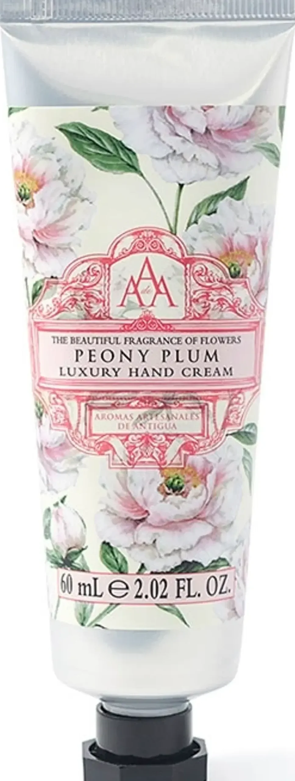 Aromas Artesanales de Antigua (AAA) Peony Plum käsivoide kosteuttaa ihoa ja jättää kädet silkinpehmeiksi. Sisältää pehmentävää sheavoita ja kosteuttavaa glyseriiniä. Pionin hienostunut ja herkkä tuoksu.
