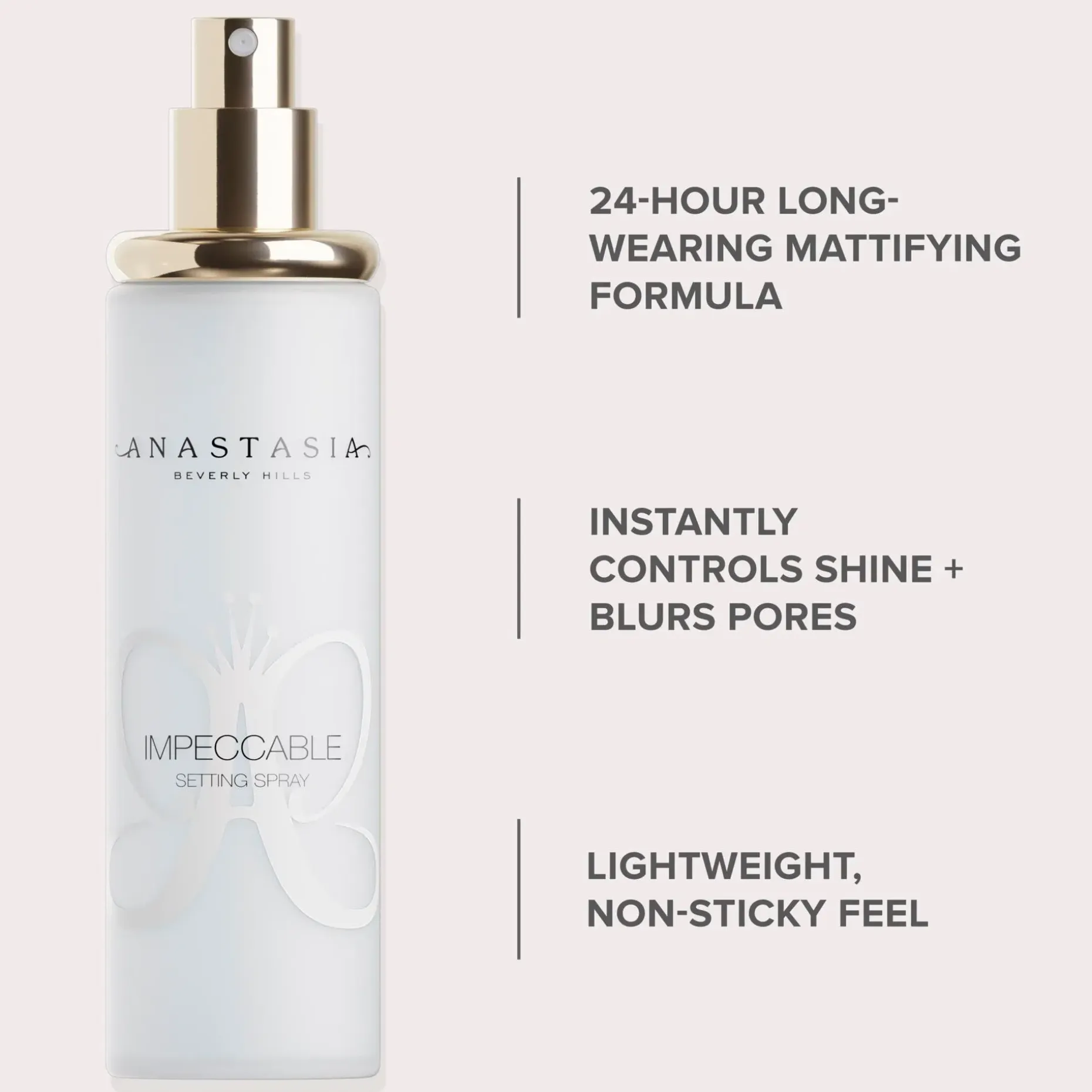 Impeccable 24H Blurring Matte Setting Spray kiinnittää meikin tehden iholle samettisen mattaisen lopputuloksen joka kestää jopa 24 tuntia. Ihoa hoitava ja kosteuttava koostumus häivyttää ihohuokosia, hienoja juonteita ja ryppyjä. Saavuta tasainen ja luonnollinen lookki joka kestää koko päivän ilman ihon kiiltelyä.