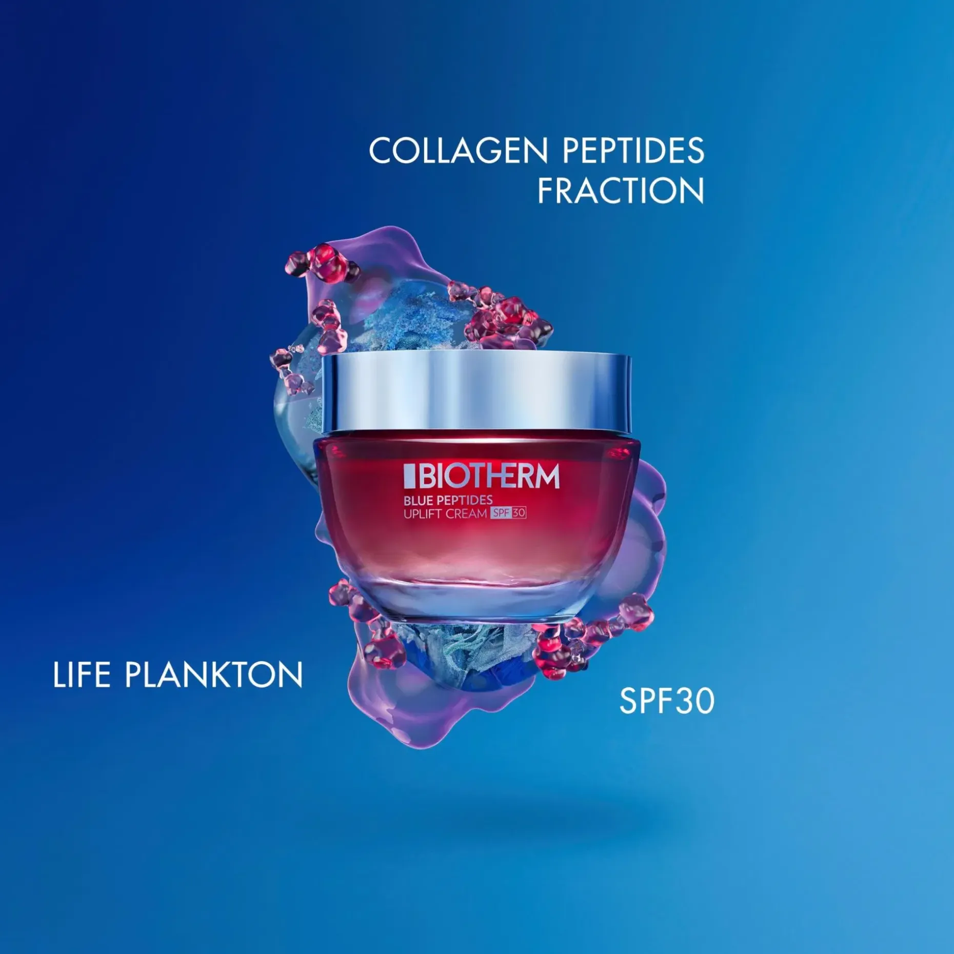 Biotherm Blue Peptides Uplift Moisturizing Cream SPF30 on Biothermin uuden Blue Peptides -ihonhoitosarjan jäsen, joka antaa kiinteämmän ihon ja hehkun. Blue Peptides Uplift Cream SPF 30 on kosteuttava ja kiinteyttävä päivävoide kaikille ihotyypeille, myös herkälle iholle. Koostumus sisältää uraauurtavia biotieteellisiä innovaatioita ja kollageenipeptidifraktioita sekä Biothermin avainainesosaa Life Plankton™ia ja ne kompensoivat ihon kollageenin menetyksestä johtuvia näkyviä ikääntymisen merkkejä ja auttavat säilyttämään ihon kiinteänä. Koostumus sisältää myös tehokkaan suojakertoimen, joka suojaa ihoa auringon UV-säteitä vastaan ja niiden aiheuttamilta ikääntymisen merkeiltä.