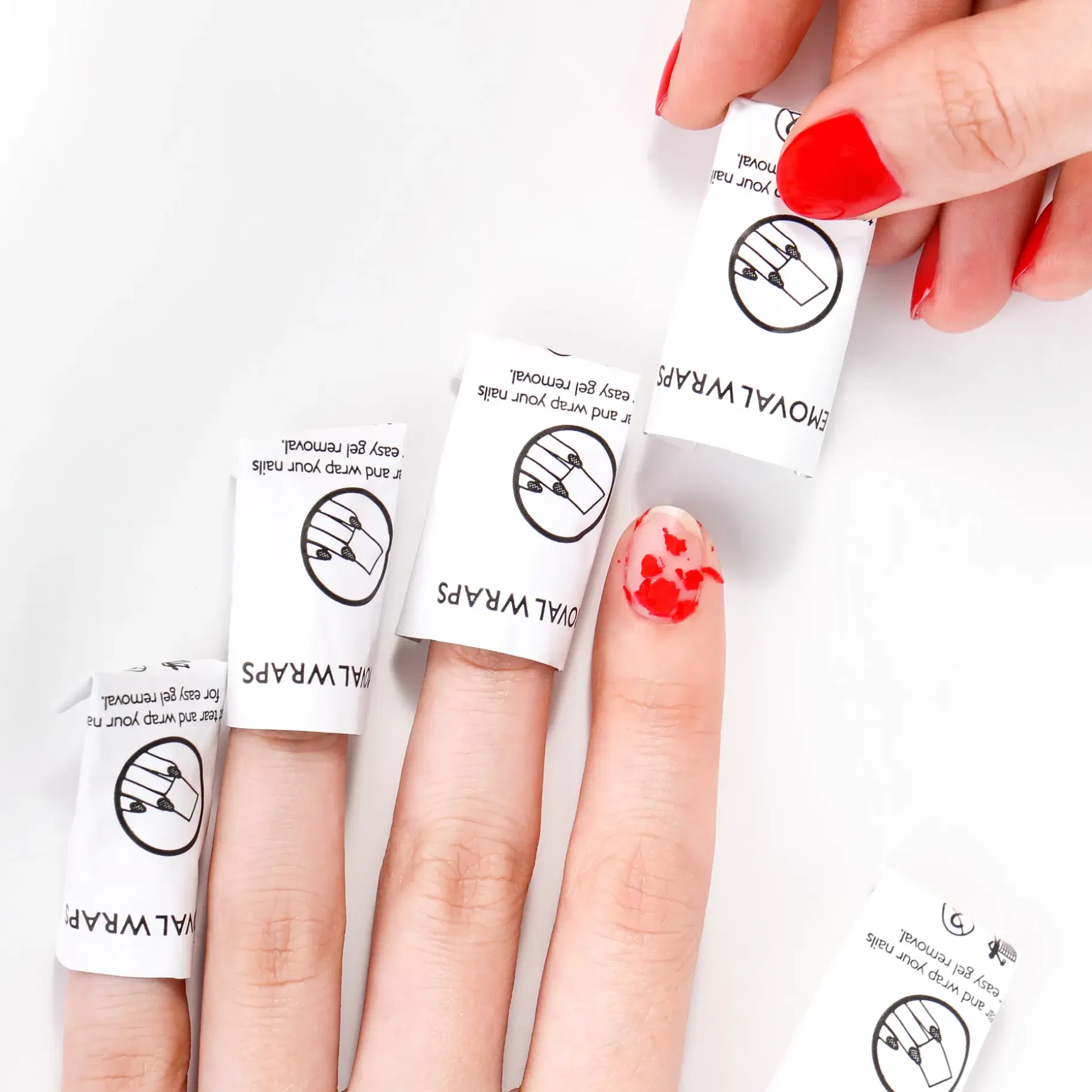Karhenna lakkauksen pinta, aseta sormi pussiin ja anna lakkauksen pehmetä n. 10min, rapsuta pehmennyt lakka pois kynneltä.