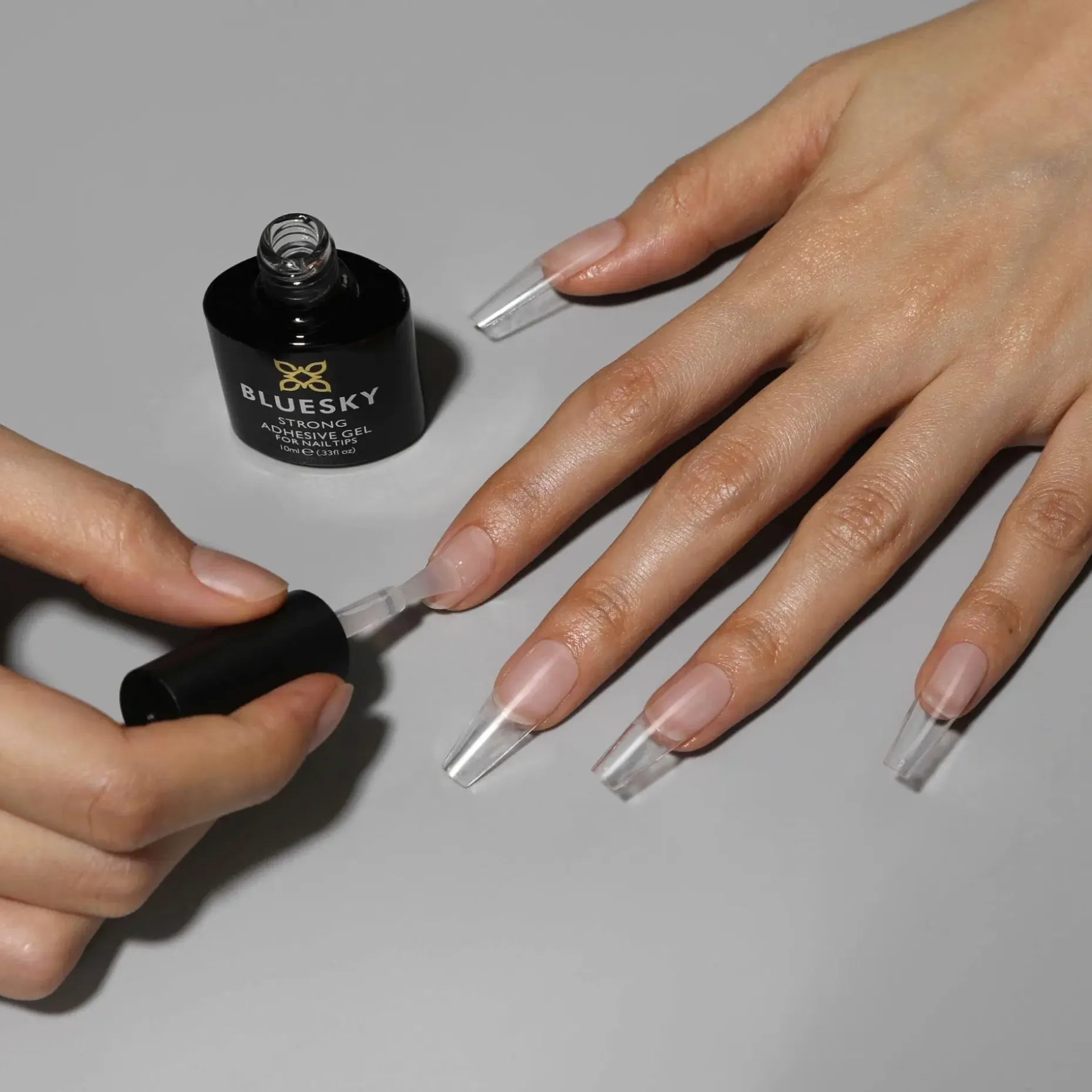 9. Laita Strong Adhesive geeliliimaa tipin sisäpuolelle. Paina tippi kynnelle aloittaen kynsinauharajasta. Varmista, ettei tipin alle muodostu ilmakuplia.