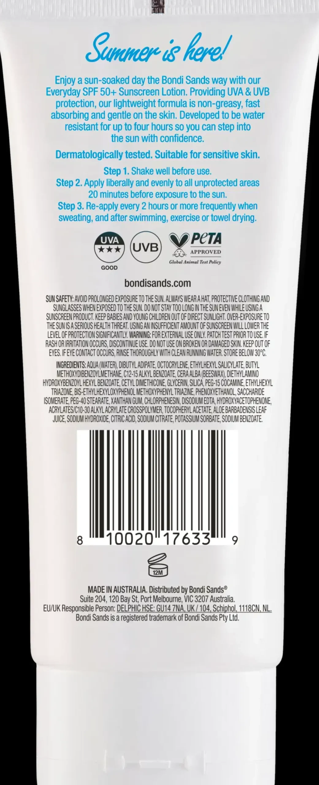 Kesä on täällä! Nauti aurinkoisesta päivästä Bondi Sandsin tavalla Everyday SPF 50+ -aurinkosuojavoiteellamme. UVA- ja UVB-suojan antava kevyt koostumus on rasvaton, nopeasti imeytyvä ja hellävarainen iholle. Vedenkestävä jopa neljä tuntia, joten voit astua aurinkoon luottavaisin mielin. Dermatologisesti testattu. Sopii herkälle iholle.