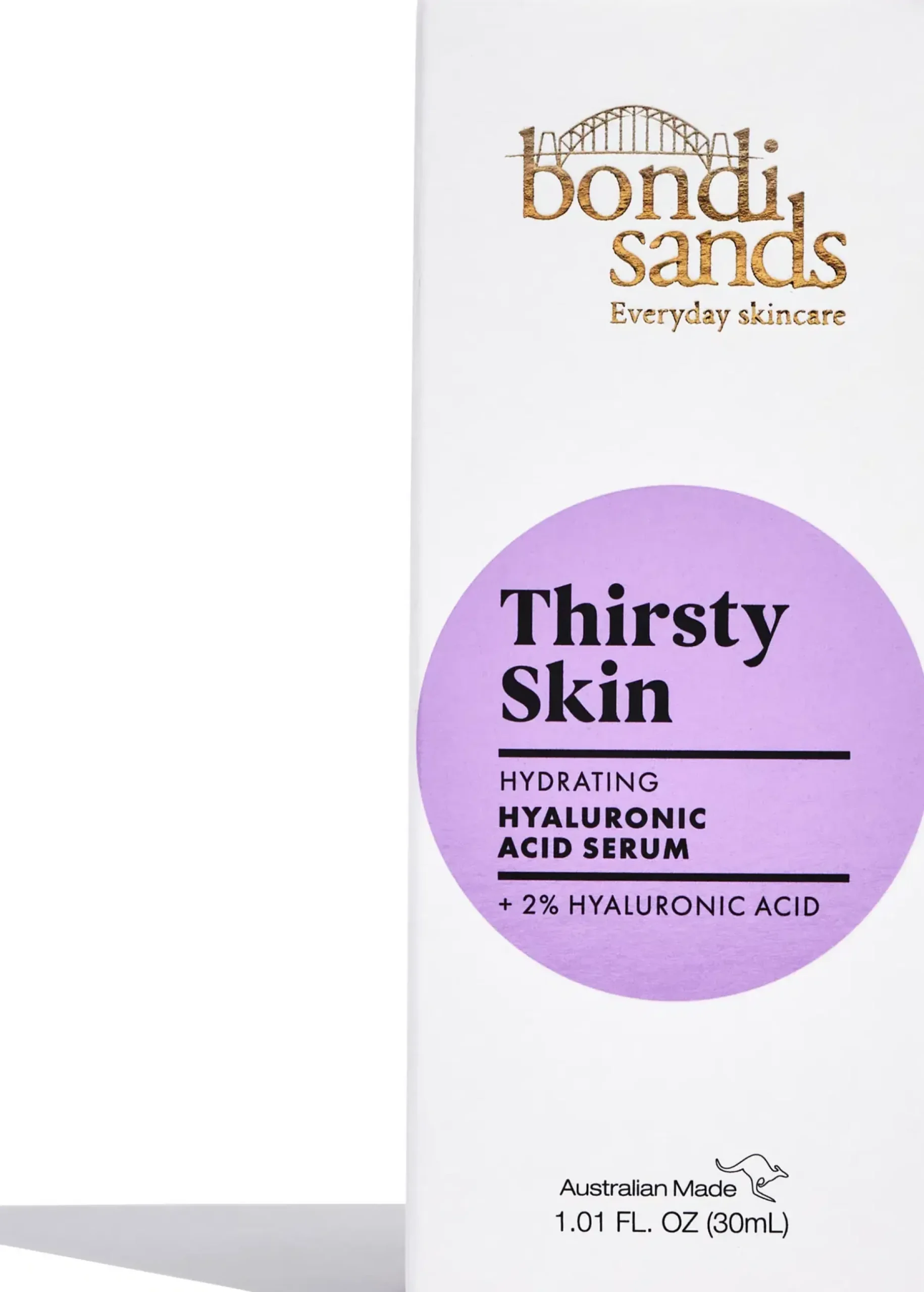 Sammuta ihosi jano Bondi Sandsin kosteuttavan Hyaluronic Acid Serum Thirsty Skin -seerumin avulla. Hyaluronihappoa, levää ja hibiskuksen kukkaa sisältävä seerumi kosteuttaa ihoa tehokkaasti ja auttaa ylläpitämään kosteutta. Lopputulos? Täyteläinen ja raikas iho.