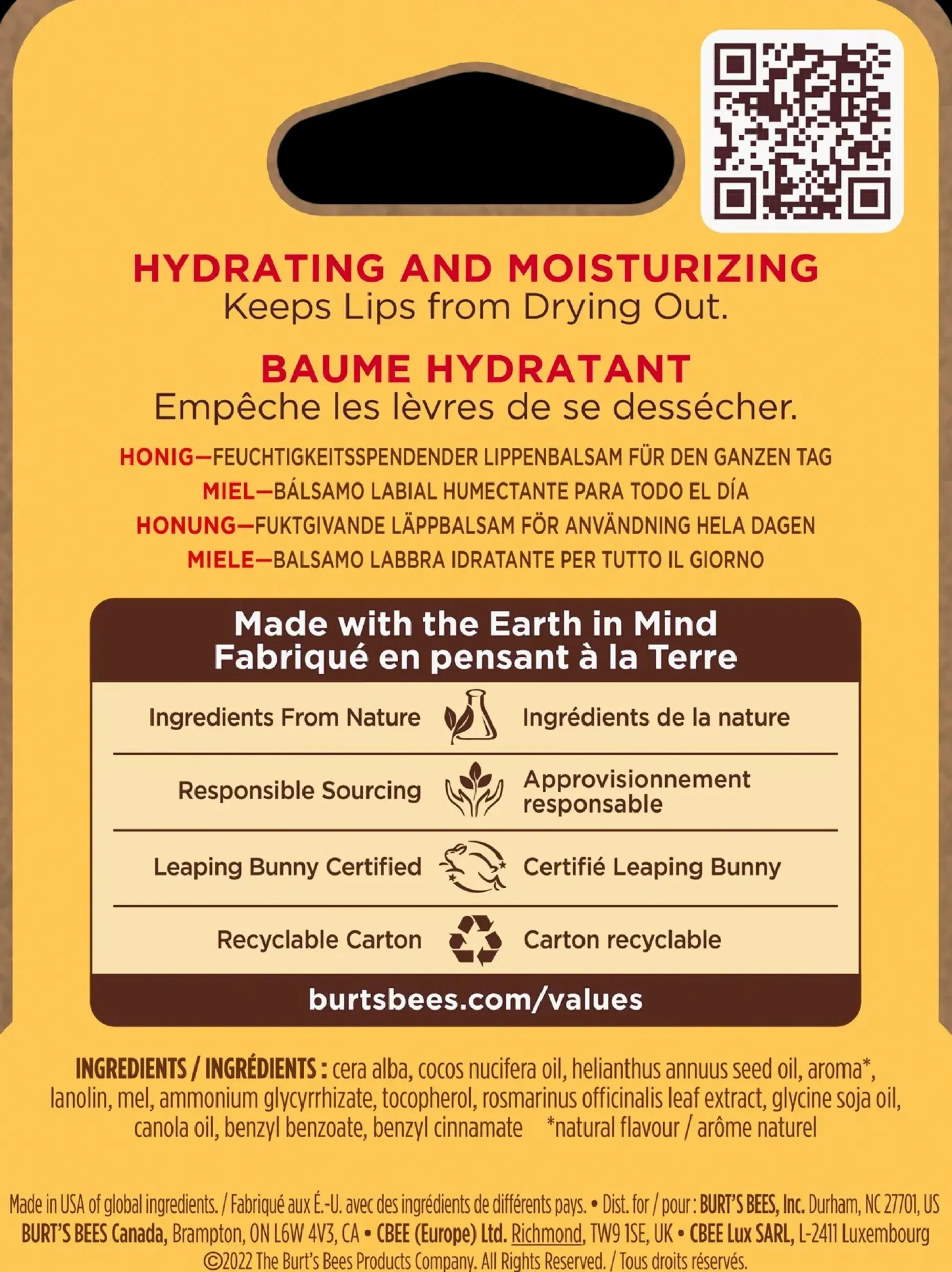 Burt’s Bees Honey Lip Balm, makealla ja rauhoittavalla hunajalla, on 100% luonnollinen ja se ravitsee ja kosteuttaa huuliasi. Mehiläisvahan, karitevoin, manteliöljyn ja lanoliinin ansiosta se pitää huulet pehmeinä ja hyvinvoivina. Täydellinen mukaan otettavaksi laukkuun tai taskuun, jotta voit helposti kosteuttaa huuliasi missä vain, milloin vain.