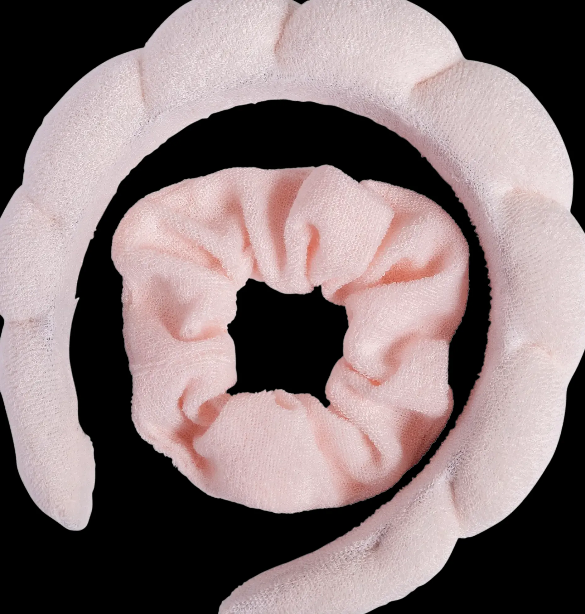 Froteinen ihonhoitopanta ja hiusdonitsi -setti. Meikkaamiseen, kasvojenpesuun tai naamion vaikuttamisen ajaksi. Vaaleanpunainen, pehmeää froteeta.