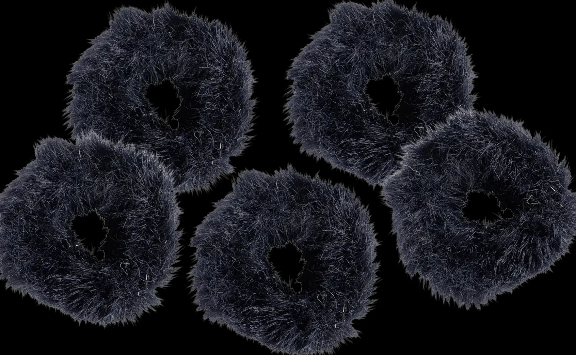 Pörröinen hiuslenkkisetti. Setti sisältää 5 kpl mustia paksuja ja pörröisiä hiuslenkkejä. Yhden hiuslenkin halkaisija n. 5 cm.