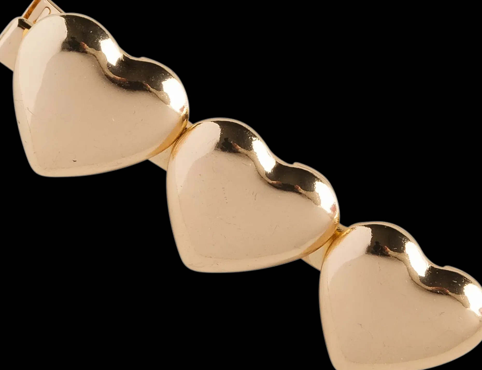 Kaunis hiussolki kullanvärisillä sydänkoristeilla. Soljen leveys noin 6 cm.