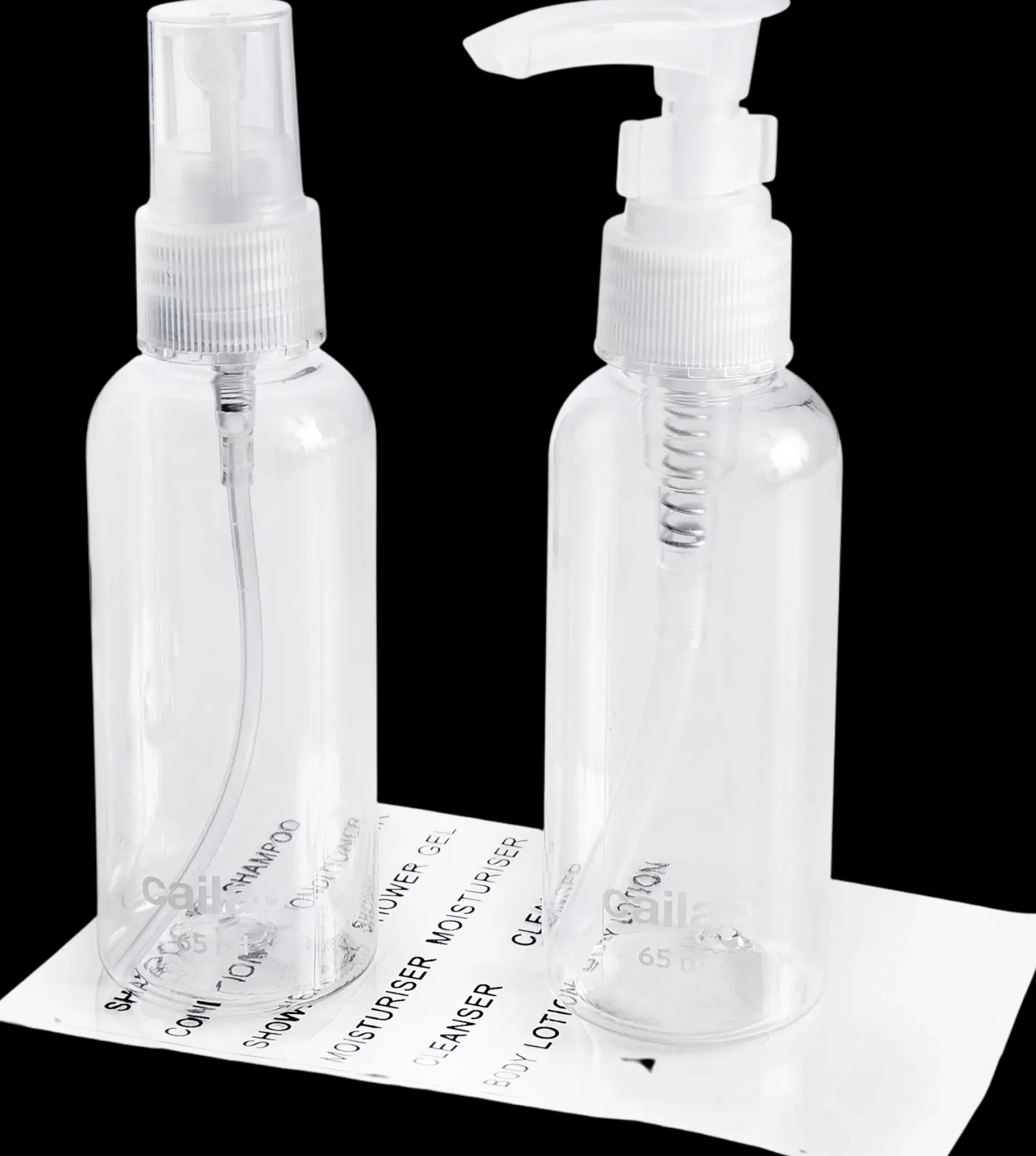 Matkaspray- ja pumppupullo. Helposti täytettäviin muovipulloihin voi ottaa matkalla tarvittavan määrän suosikkituotteita mukaan. Sisäkorkki tekee pullosta tiiviin. Pumppupullossa lukituspidike suojaamassa ettei pumppu painu alas matkatavaroiden joukossa. Pakkaus sisältää 2 matkapulloa (65 ml). Pullon tilavuus painettu pullon etupuolelle. Mukana sisältötarrat, jotka voit liimata pulloihin.