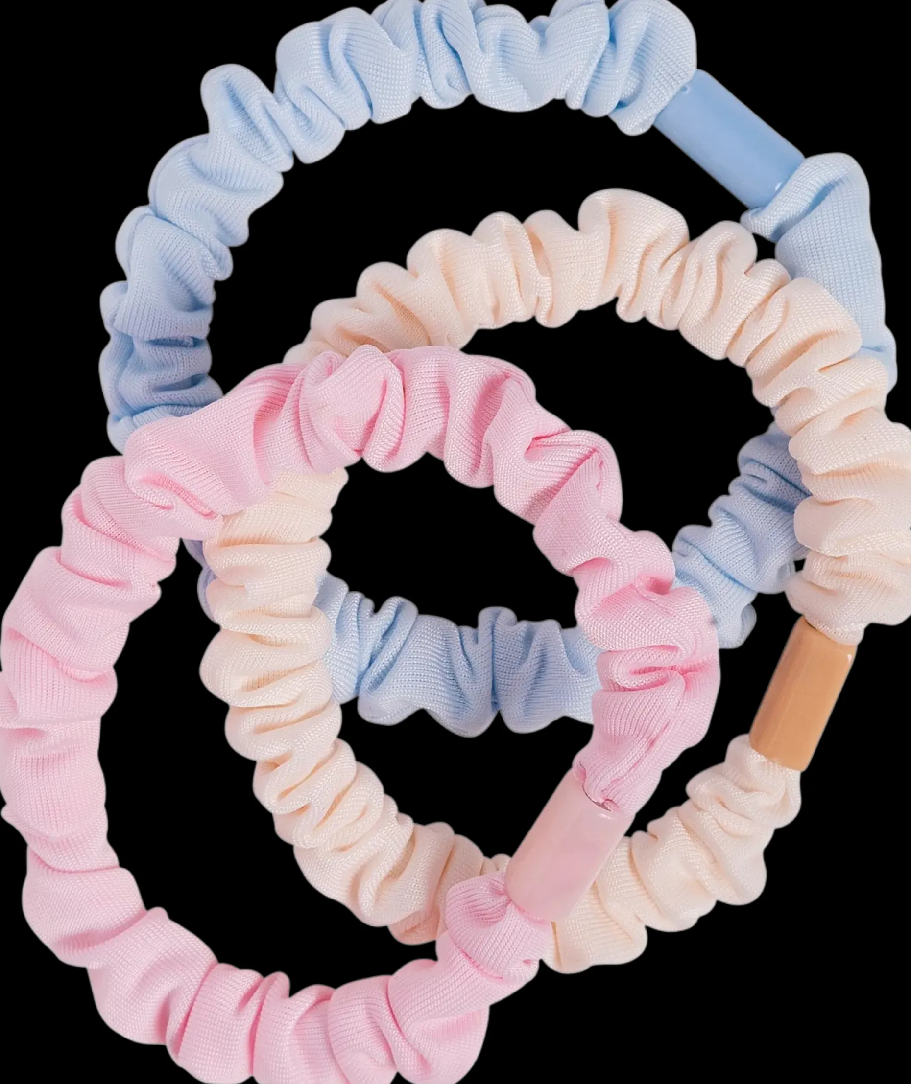 Trendikäs hiuslenkkisetti, jossa 3 kpl ohuita punottuja vaaleansinisen, vaaleanpunaisen sekä kerman värisiä hiuslenkkejä. Hiuslenkin halkaisija n. 6 cm. Materiaali punottu lanka, muovi.