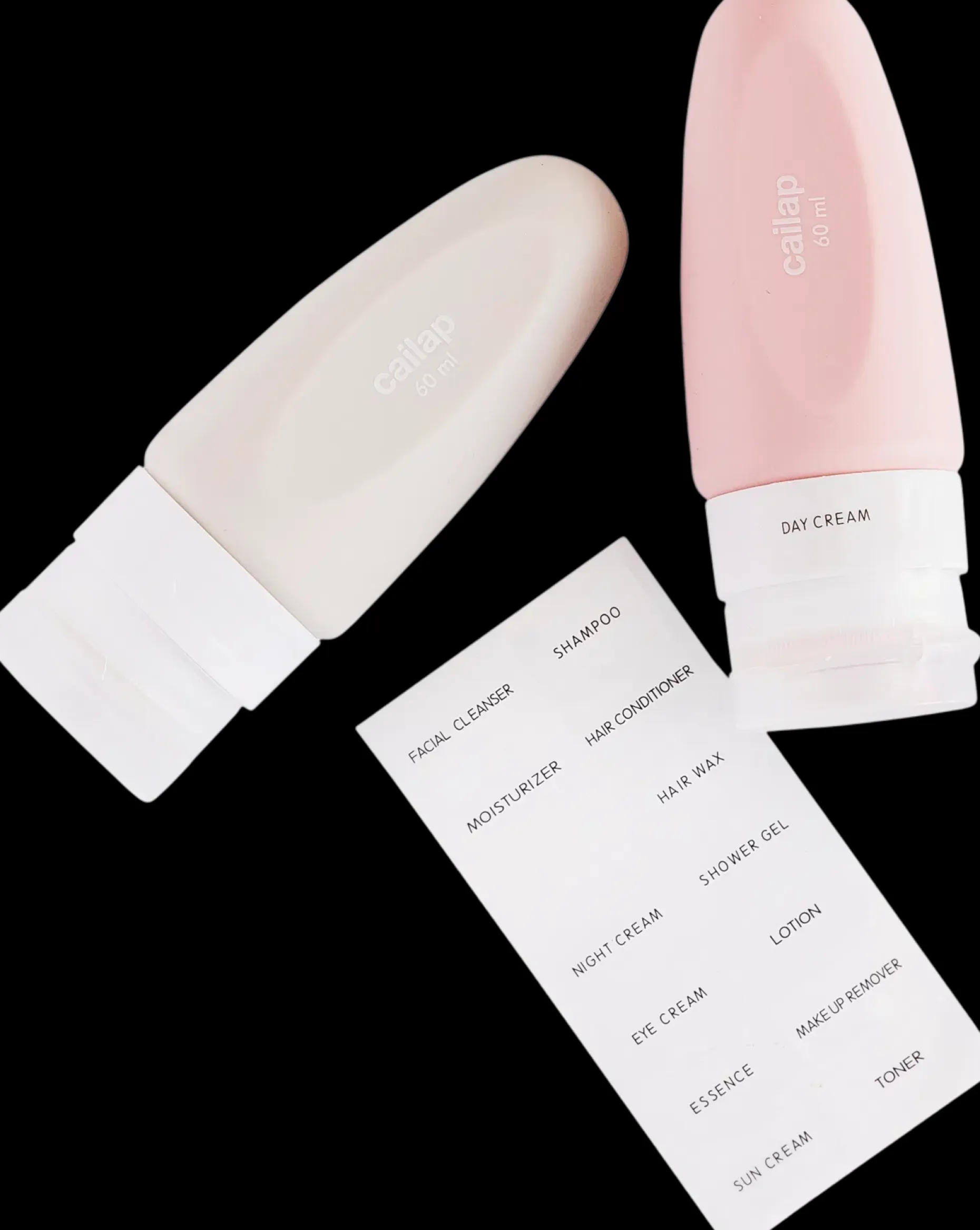 Pehmeät silikoniset matkapullotuubit, 2 kpl 60 ml. Helppo ja kätevä täyttää, käyttää ja puhdistaa. Tilavuus painettu pullojen etupuolelle. Mukana sisältötarrat, jotka voit liimata pulloihin.