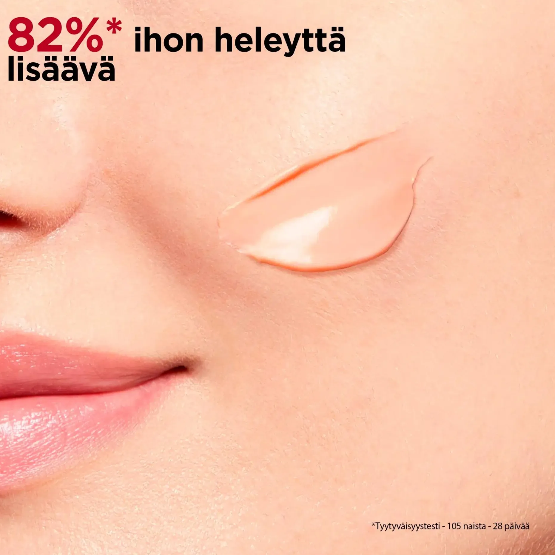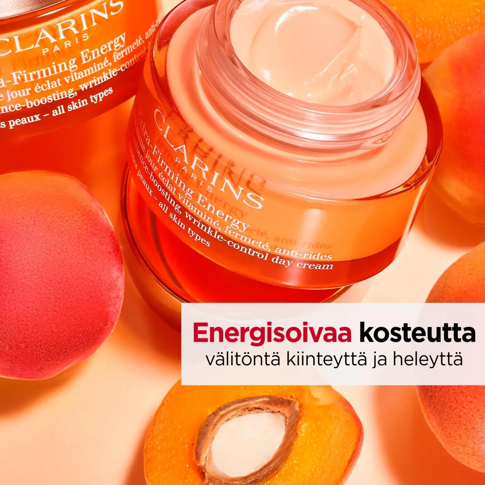 Heleyttävä, juonteita silottava päivävoide. Clarins Extra-Firming Energy on kiinteyttävä päivävoide, jonka kevyesti sävytetty koostumus kaunistaa ja heleyttää ihoa välittömästi. Päivävoide sisältää ihon energian tuotantoa tukevan, ihoa heleyttävän sekä ihoa ravitsevan kasviperäisen Glow Plus Complexion –yhdisteen. Päivä päivältä iho on kosteampi, kiinteämpi ja hehkuvampi sekä täynnä energiaa.