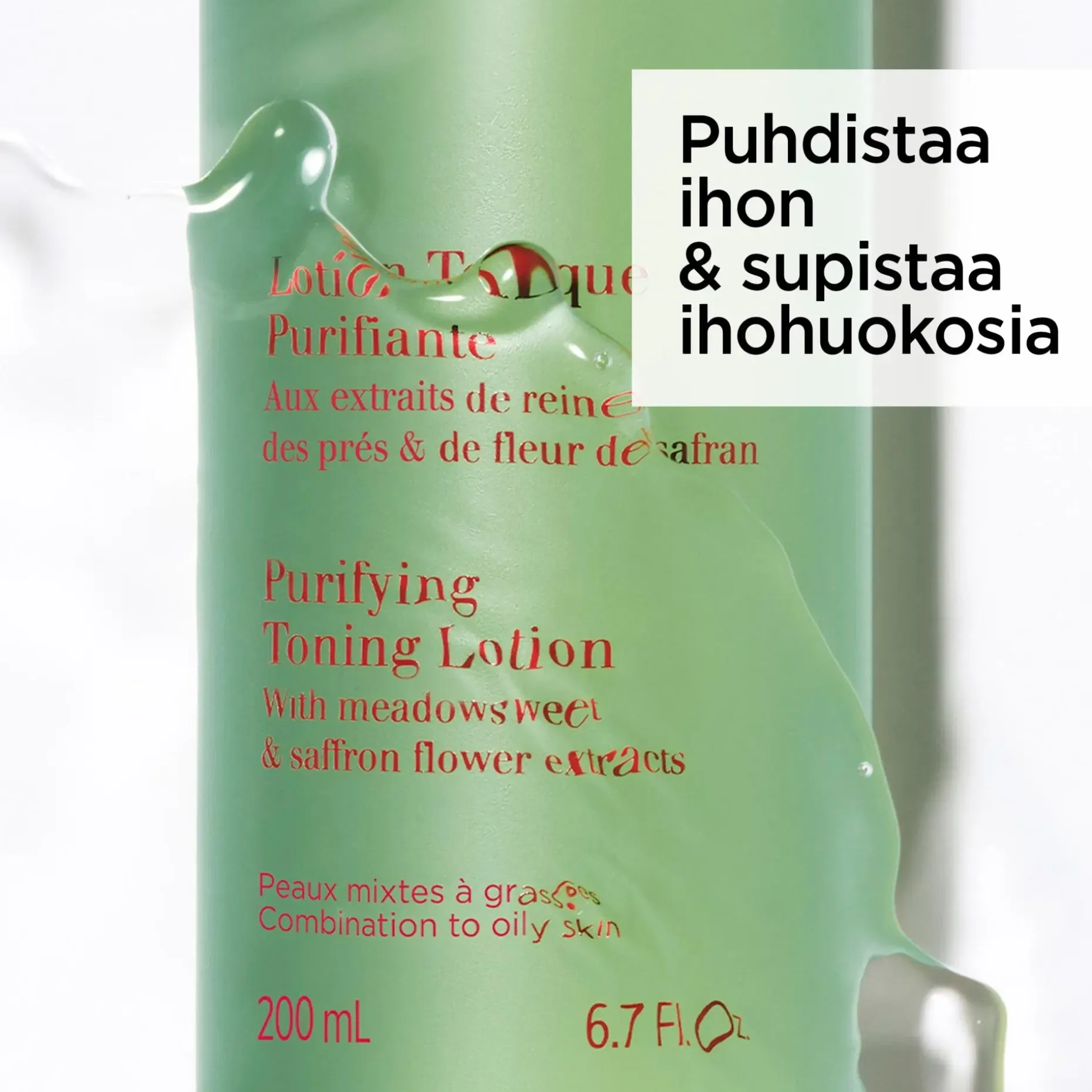 Clarins Purifying Toning Lotion on alkoholiton kasvovesi sekaihosta rasvaiselle iholle. Runsaasti kasviuutteita sisältävä kasvovesi tasapainottaa ihoa sekä valmistelee ihon seuraaville ihonhoitotuotteille. Kasvoveden sisältämät mesiangervo- ja taikapähkinä-uute supistavat ihohuokosia, puhdistavat ja kirkastavat ihoa. Kasvovesi sisältää merileväpohjaisen Microbiote Complex -yhdisteen, joka ylläpitää ihon normaalia mikrobiomia ja pitää ihon tasapainoisena. Koostumuksen raaka-aineista 97 % on luonnollista alkuperää.