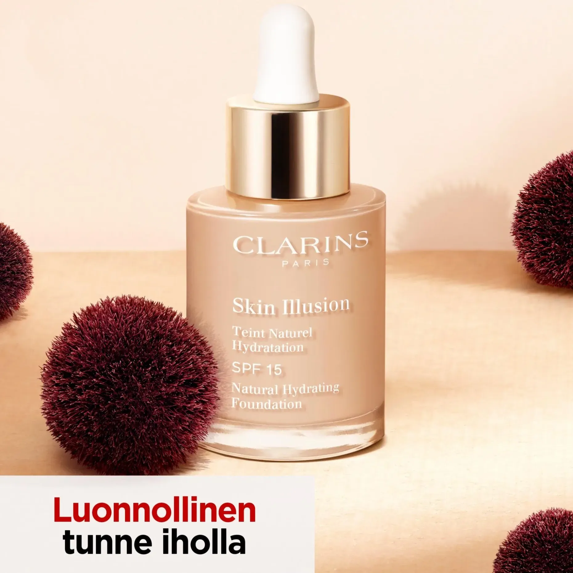 Clarins Skin Illusion SPF 15 -meikkivoide. Erittäin hoitava, luonnollisen hehkun antava, ihon virheellisyyksiä häivyttävä nude-meikkivoide, joka sisältää HD Light Optimizing Complex -yhdistettä. Se on sekoitus valoa heijastavia helmiä, jotka antavat välittömän läpikuultavan hehkun kasvoille, ja Soft Focus Powder -puuteria, joka vangitsee valon välittömästi kasvoille.