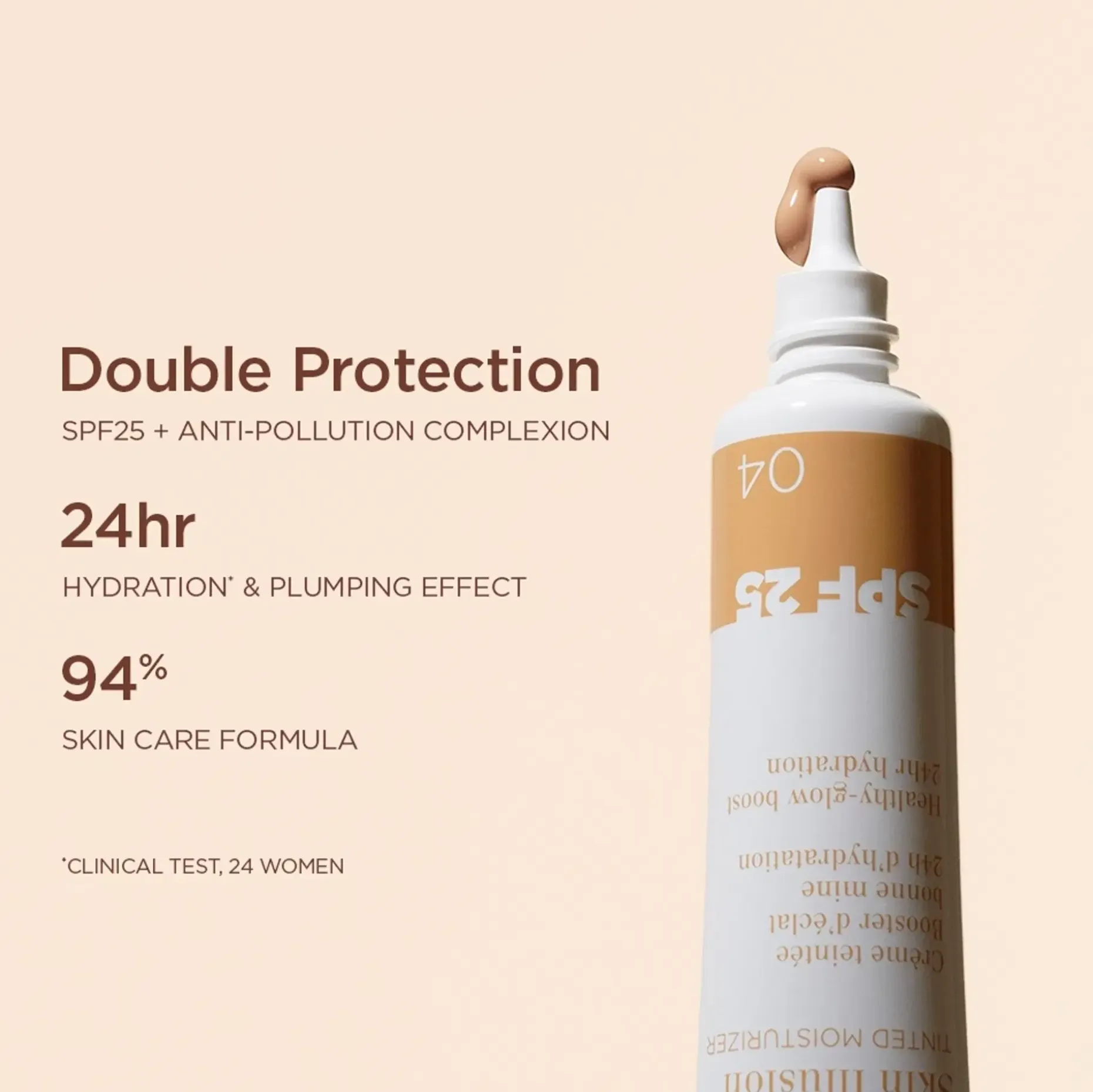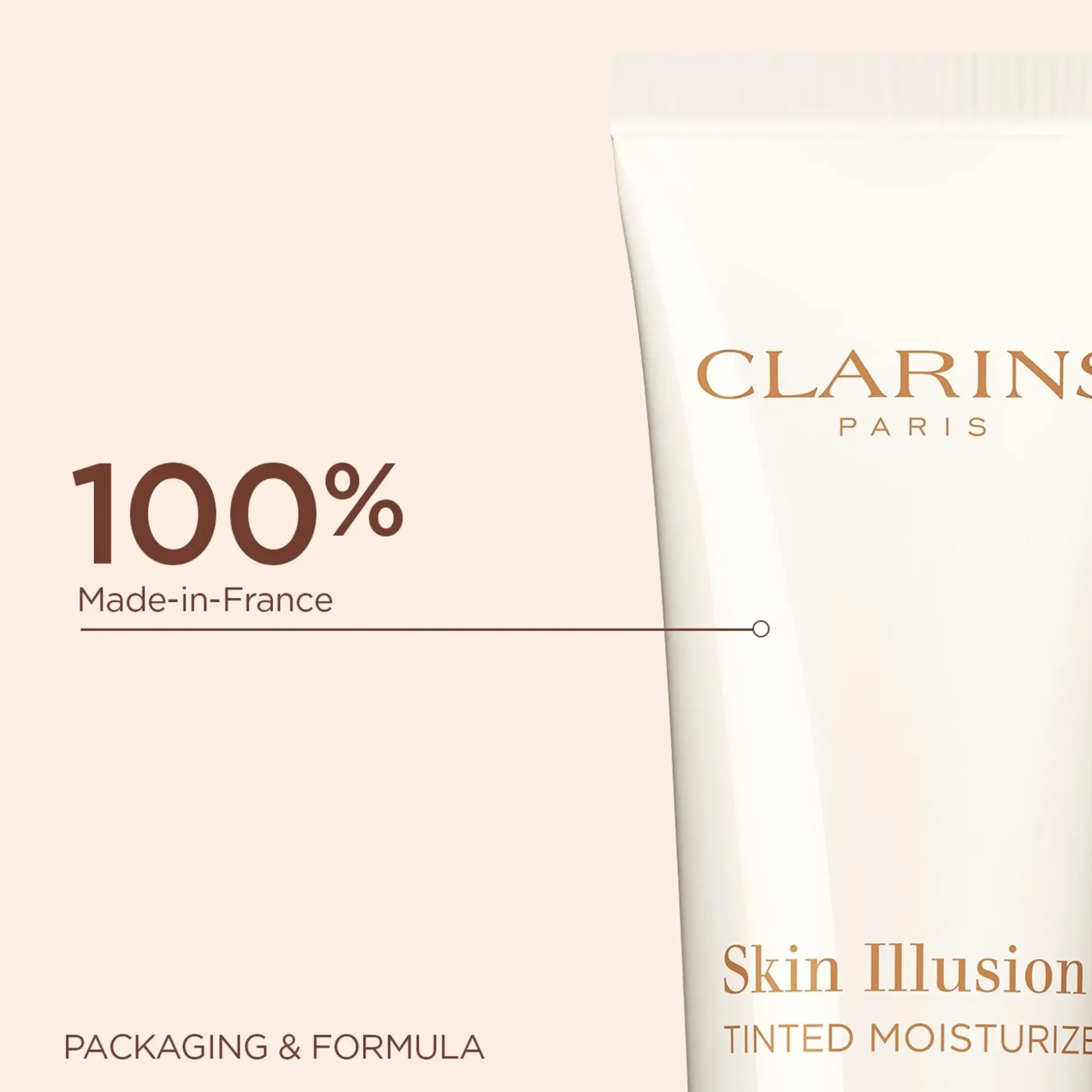 Sen asiantuntevan koostumuksen ytimessä: yli 80% orgaanisia aktiivisia ainesosia ja 94% ihonhoitopohjaa, jossa on matalan molekyylipainon hyaluronihappoa, joka auttaa kosteuttamaan ihoa. Skin Illusion Tinted Moisturiser sisältää myös suojakertoimen SPF25 ja Clarins Anti-Pollution Complexin.