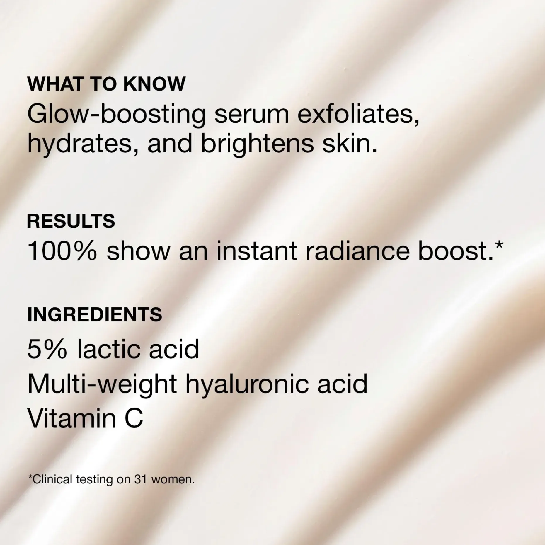Maitohappo (5 %) kuorii ihon pintakerrosta hellävaraisesti, poistaa kuolleita ihosoluja ja edistää solujen uusiutumista, jättäen ihon sileämmäksi ja tasaisemmaksi. Hyaluronihappo syväkosteuttaa ihoa sitomalla kosteutta, parantaen ihon kimmoisuutta ja täyteläisyyttä. C-vitamiini kirkastaa ihoa, tasoittaa ihonsävyä ja suojaa ihoa vapailta radikaaleilta.