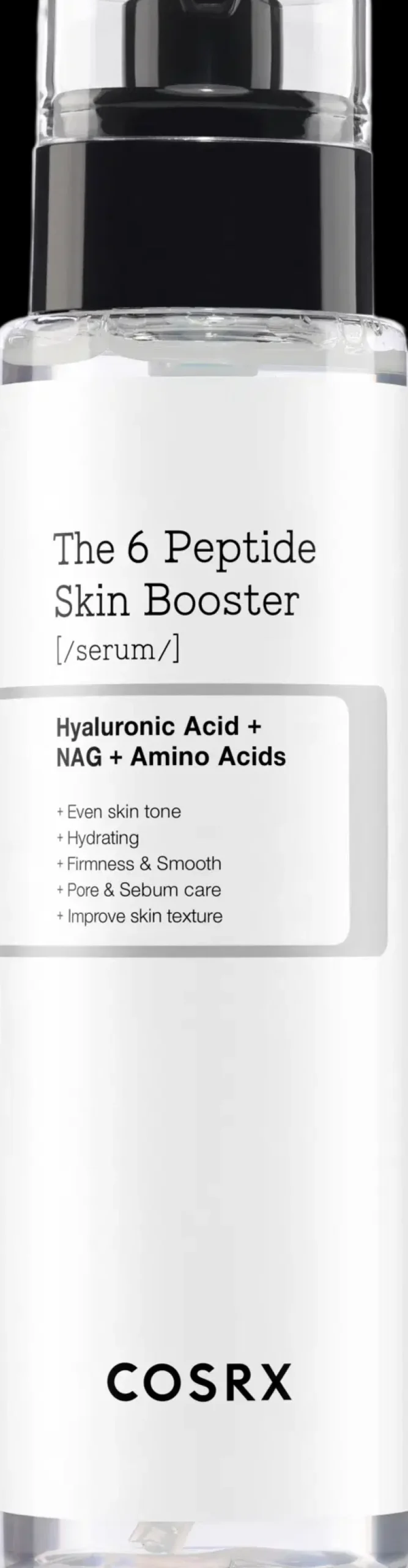 COSRX 6 Peptide Skin Booster seerumi on monitehoinen peptidejä sisältävä seerumi. Seerumi tasoittaa ihon pieniä juonteita, kirkastaa ja rauhoittaa ihoa. Seerumi parantaa ihon tekstuuria sekä kosteuttaa ihoa. Sisältää peptidejä, hyaluronihappoa sekä niasiiniamidia.