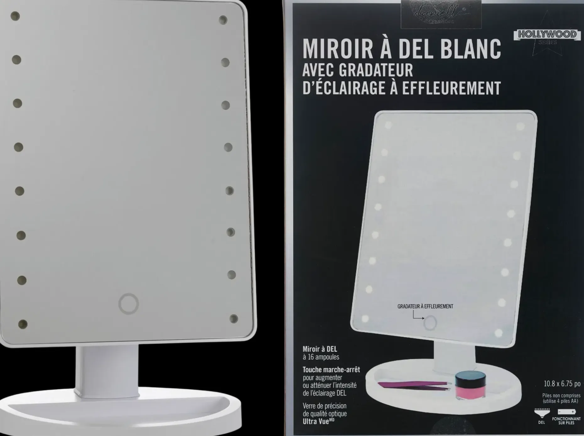 Paristokäyttöinen hollywood peili. 16 led valoa. 1 x suurennus. Paristot eivät sisälly pakkaukseen. Korkeus 27cm.
