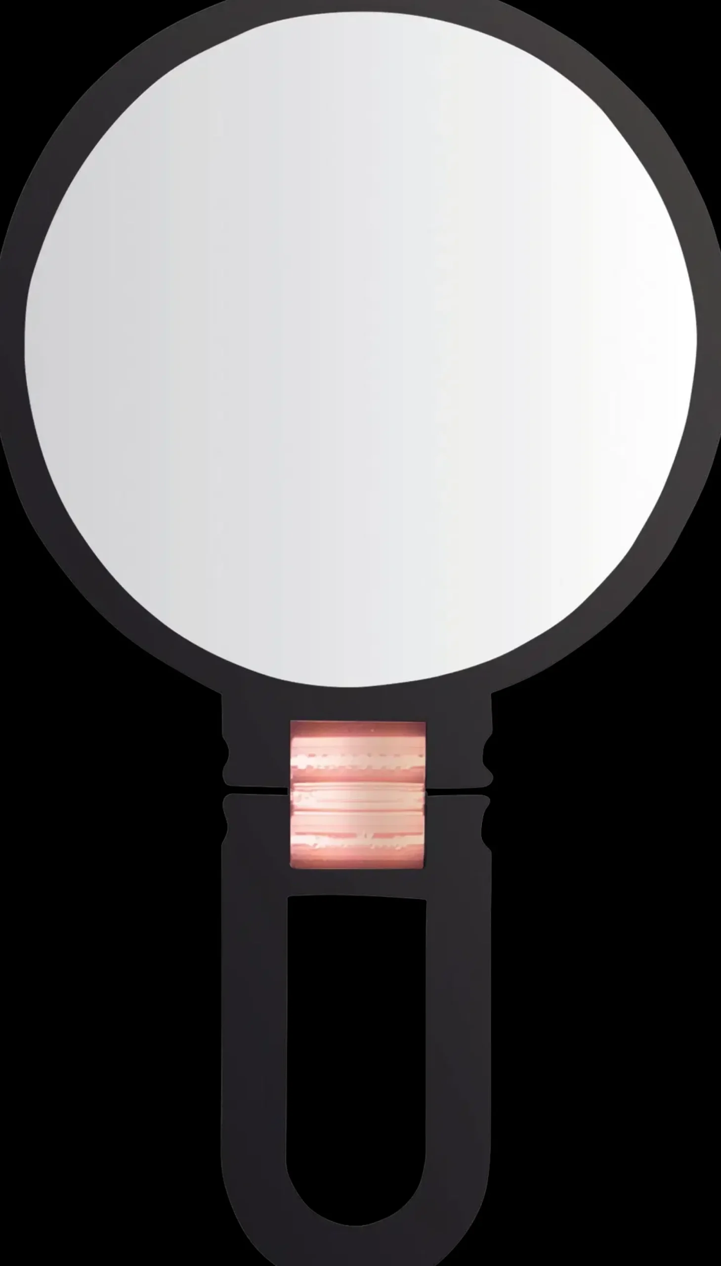 Musta soft touch käsipeili. Kätevä pieni koko ja tukeva kahva josta pitää kiinni tai taittaa jalaksi peilille. Toisella puolella 10x suurennus.