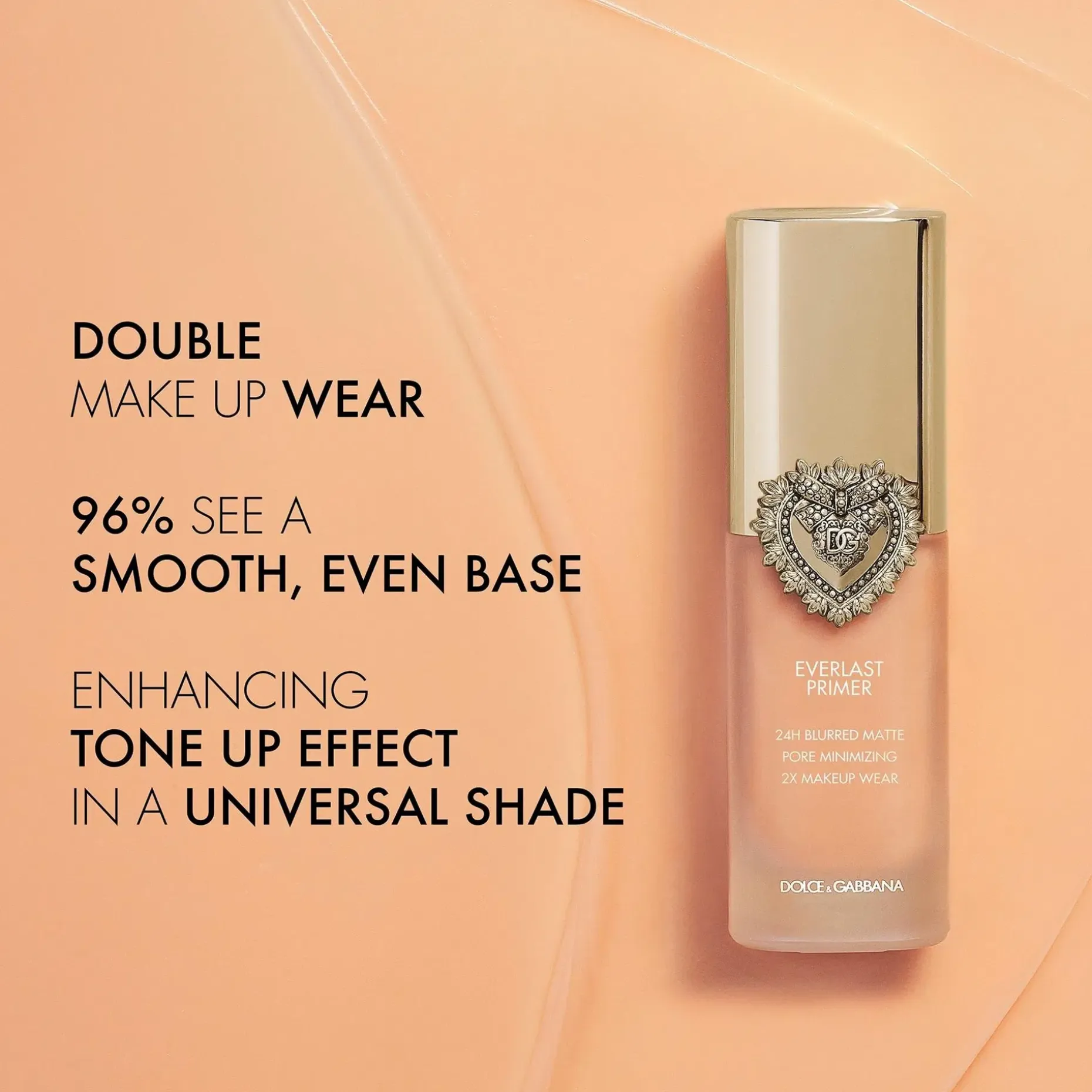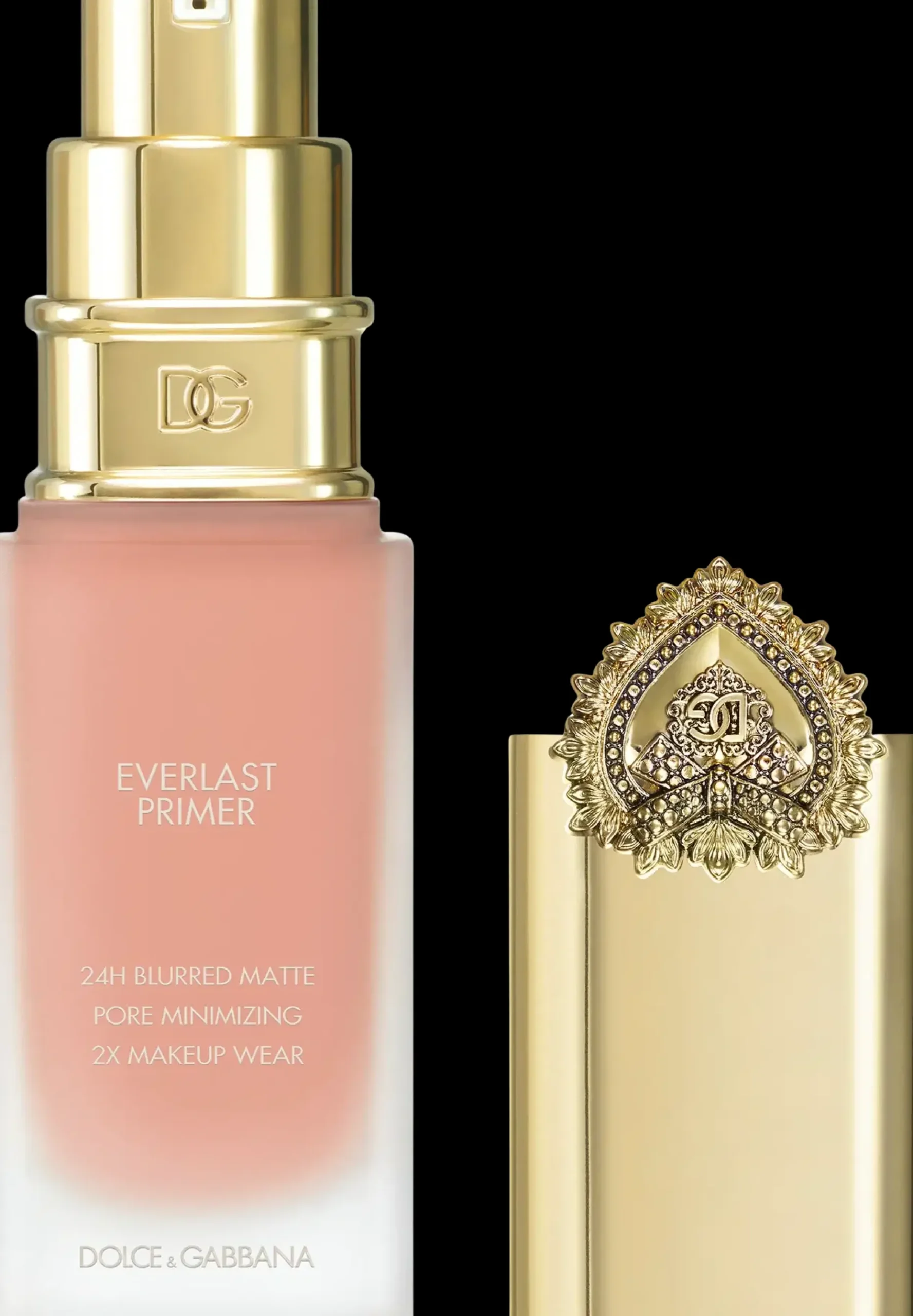 Everlast Primer on kauniissa lasipullossa, jossa on kultainen korkki, joka on sinetöity ikonisella Dolce&Gabbana Sacred Heart symbolilla.