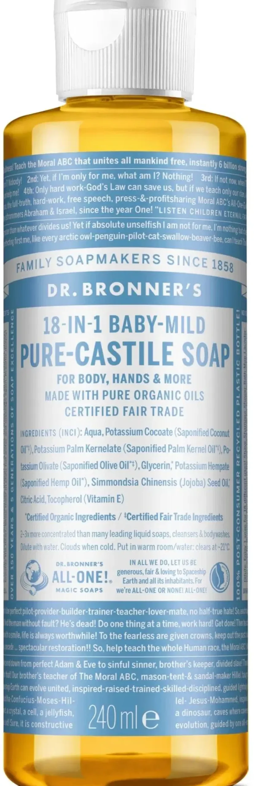 Dr. Bronner’sin 18-in-1 Castile nestemäinen saippuaklassikko, tuoksuton, on vegaani ja monikäyttöinen saippua, joka on valmistettu luonnollisista orgaanisista kookos, oliivi, palmun siemen ja jojoba öljyistä.