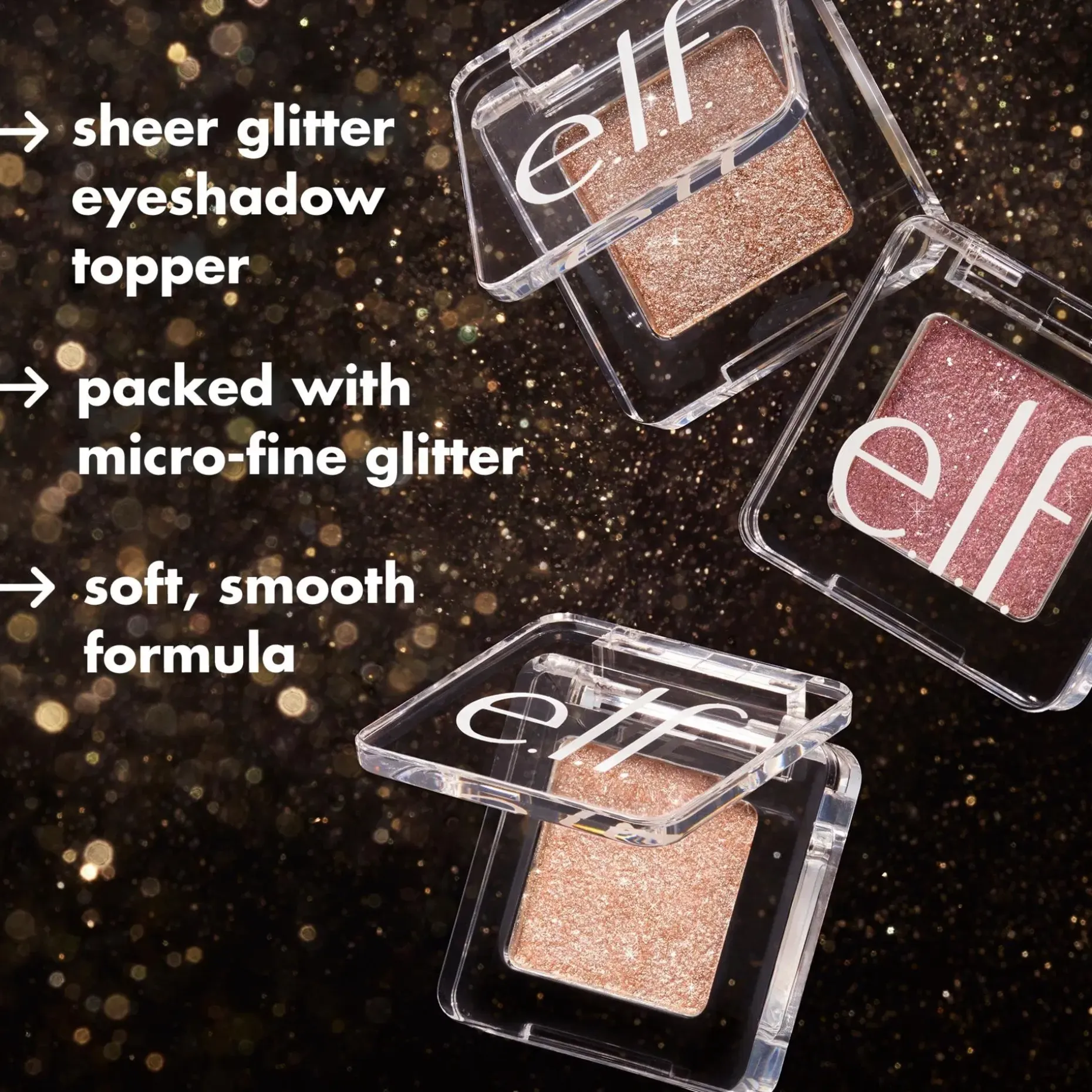 Muuta jokainen silmämeikki e.l.f.-bileiksi Cosmetics Fine as Fleck Glitter Eyeshadow! Tämä läpikuultava, häikäisevä luomiväri on täynnä mikrohienoja glitterpilkkuja, jotka piristävät katsettasi lumoavalla säihkeellä. Pehmeä, sileä koostumus levittyy helposti ja luo pitkäkestoisen meikkilookin. Voidaan käyttää yksinään hienovaraiseksi shimmeriksi tai lisäämään kiiltoa suosikkiluomivärisi päälle.