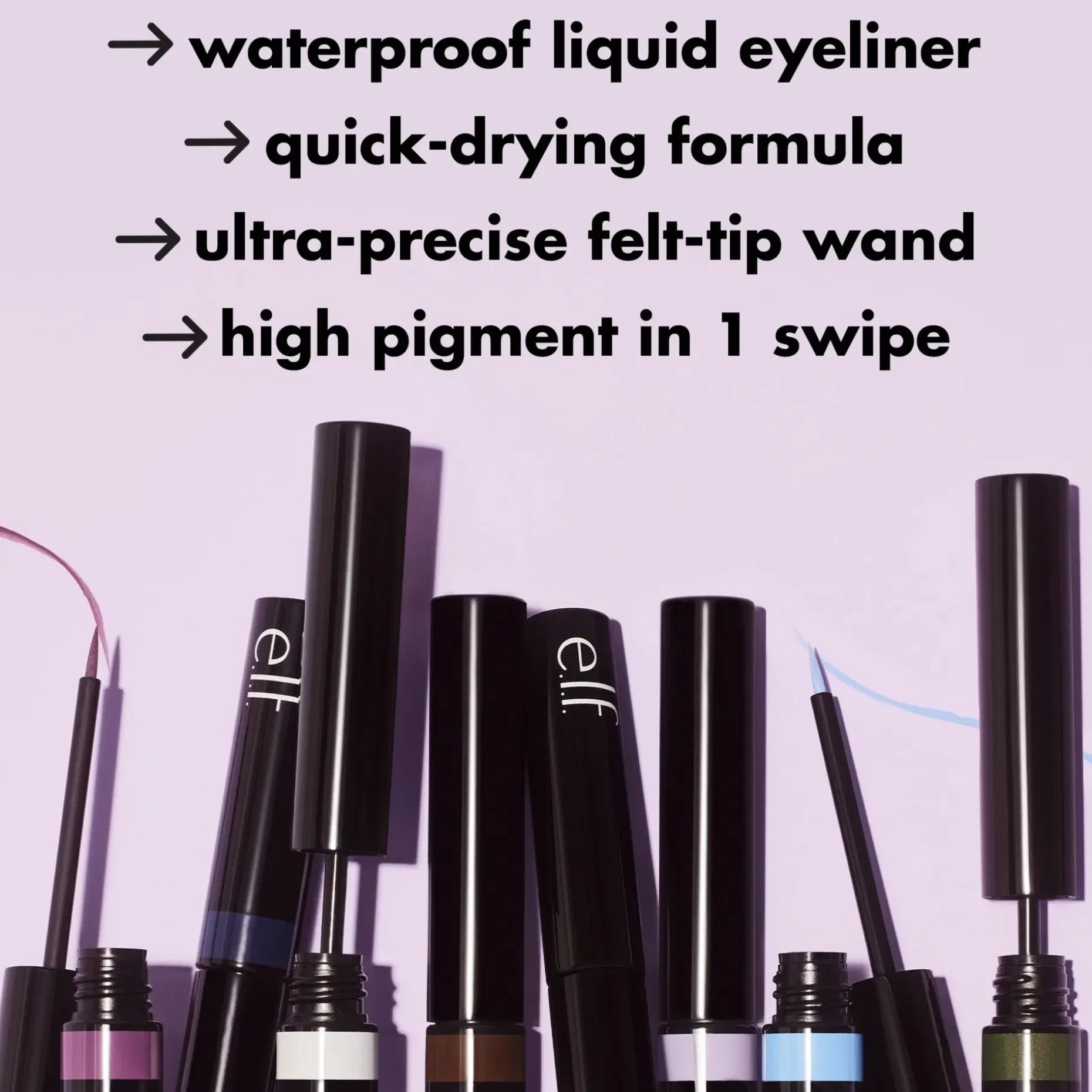 Luo rohkeita, graafisia rajauksia. e.l.f.:n Cosmetics H2O Proof Inkwell Eyeliner -silmänrajauskynä on pitkäkestoinen, nopeasti kuivuva, vedenkestävä ja nestemäinen eyeliner, jonka runsaspigmenttisyys korostaa ja syventää katsetta.