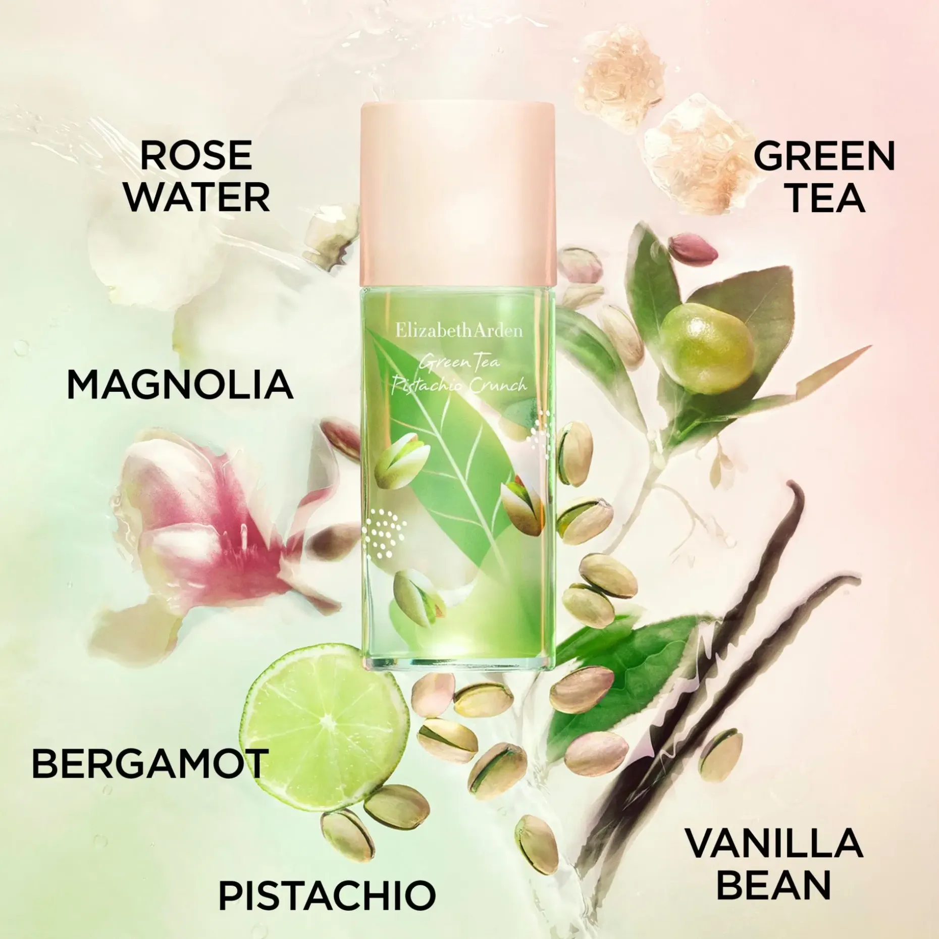 Herätä aistisi Elizabeth Ardenin UUDELLA Green Tea Pistachio Crunch Eau de Toilette -tuoksulla, joka on suolainen gourmand-tuoksu, jota piristävät helmeilevät sitrushedelmät ja pehmeät kukkaistutukset, jotka on kääritty rikkaaseen, lämpimään makeuteen. Tämä herkullinen, leikkisä tuoksu ilahduttaa pistaasinkuorisävyjen, italialaisen bergamottiöljyn, vihreän teen, heliotroopin, magnolian, Madagaskarin vaniljapavun, valkoisen meripihkan ja ruskean sokerin sävyillä.