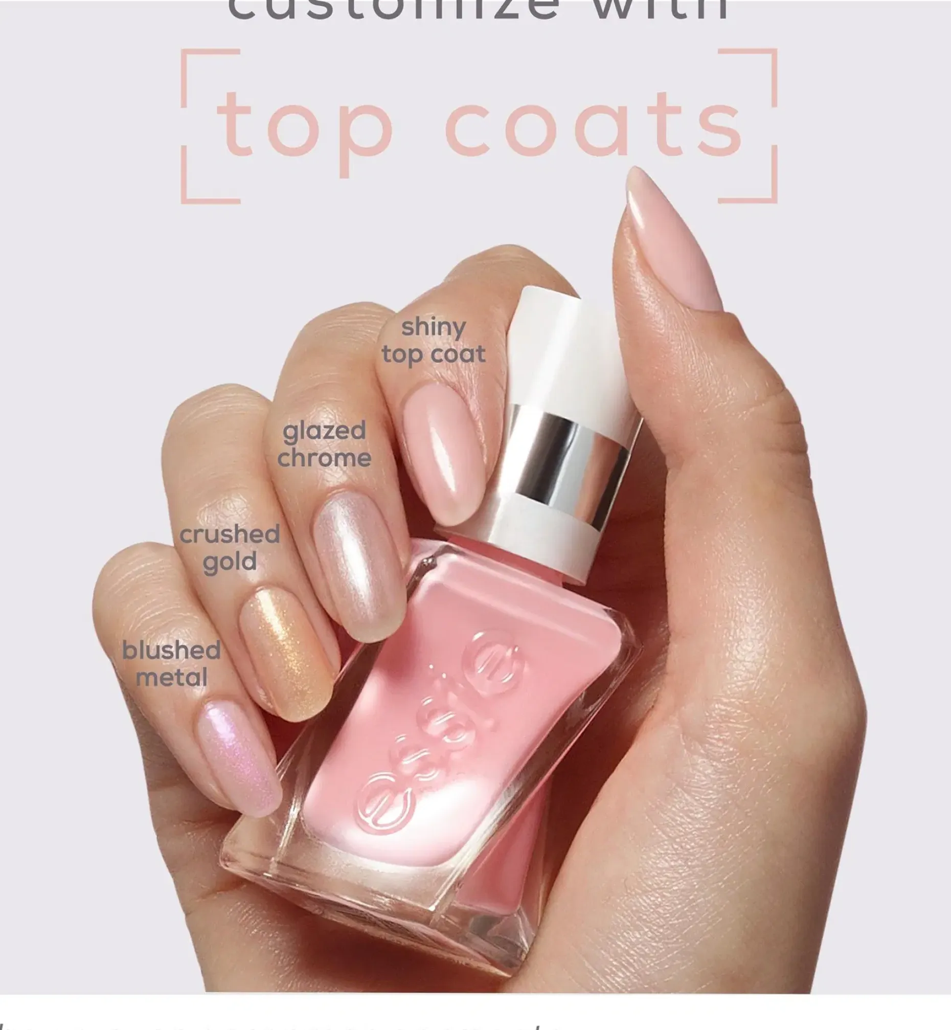 essie gel couture metallinhohtoiset päällyslakat. Anna geelilakallesi metallinhohtoinen lopputulos vain yhdellä pyyhkäisyllä. Metallihelmet päällyslakan koostumuksessa taittavat valoa ja moninkertaistavat heijastuksen 360 asteen kulmassa ja antavat erittäin kiiltävän lopputuloksen. Käytä yhdessä essie gel couture – kynsilakan kanssa ja luo upeita kynsitrendejä kotona, esimerkiksi ”vanilla chrome” ja ”glazed donut” kynnet. Kaksivaiheinen manikyyri kestää jopa 15 päivää*. Et tarvitse UV-lamppua. Levitä uusi kerros päällyslakkaa 7 päivän kuluttua. Kultakuumetta? Levitä kirkkaankeltaista päällyslakkaa värillisen geelilakan päälle heijastamaan valoa ja antamaan kimalletta. gel couture -tuotteiden edut: • Välitön kromi- tai metalliefekti • Patentoitu sivellin kierteisellä varrella antaa runsaan peittävyyden ja tekee levityksestä tarkkaa ja helppoa kotona • Vegaaninen koostumus** *Itsearviointi, 120 henkilöä, käytettäessä uusi kerros essie gel couture metallinhohtoista päällyslakkaa 7 päivän kuluttua **Ei sisällä eläinperäisiä ainesosia