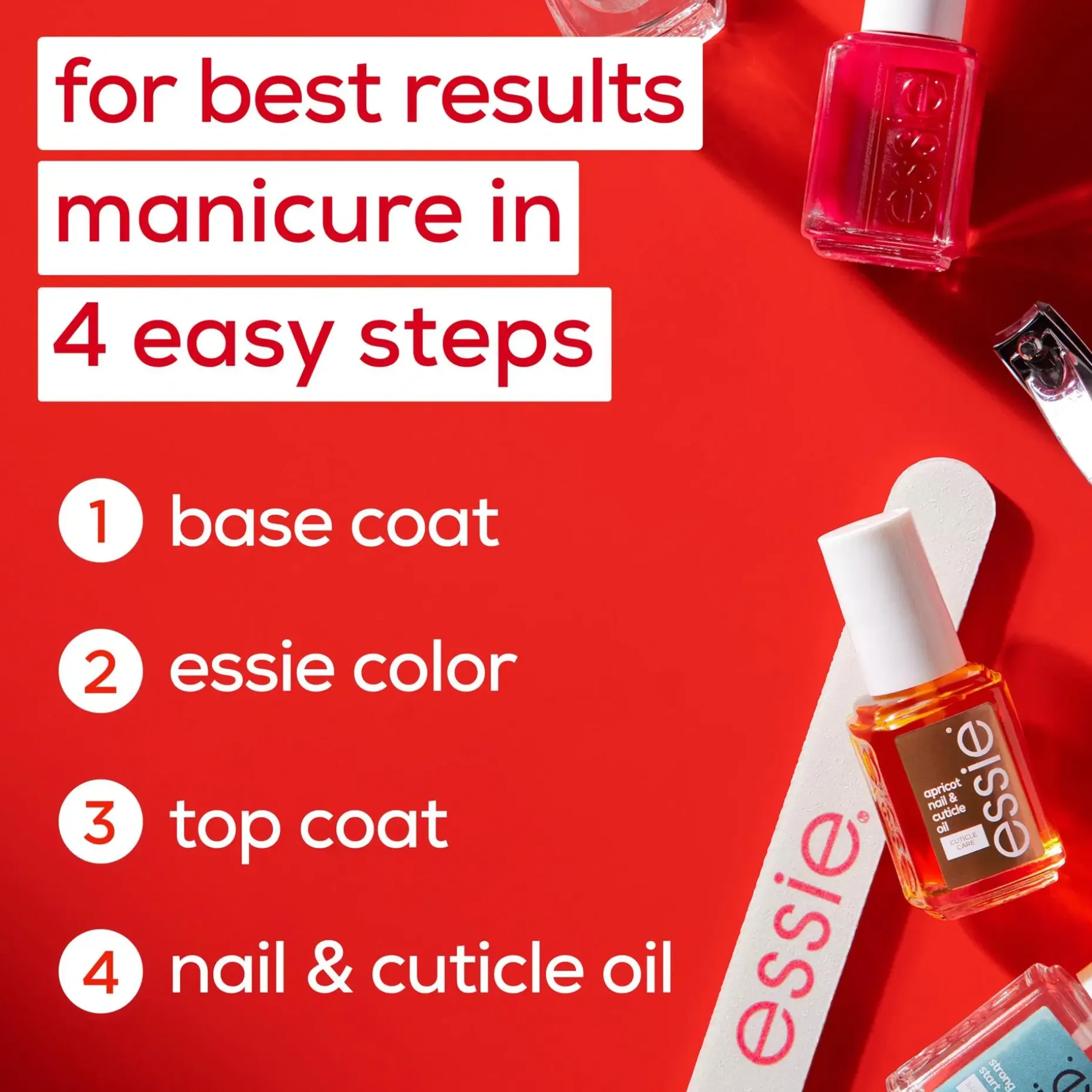Applicera ett lager essie strong start base coat på rena naglar, följt av två lager essie nagellack. Avsluta med ett lager essie top coat. Biotinen hjälper naglarna att bli starka och friska.