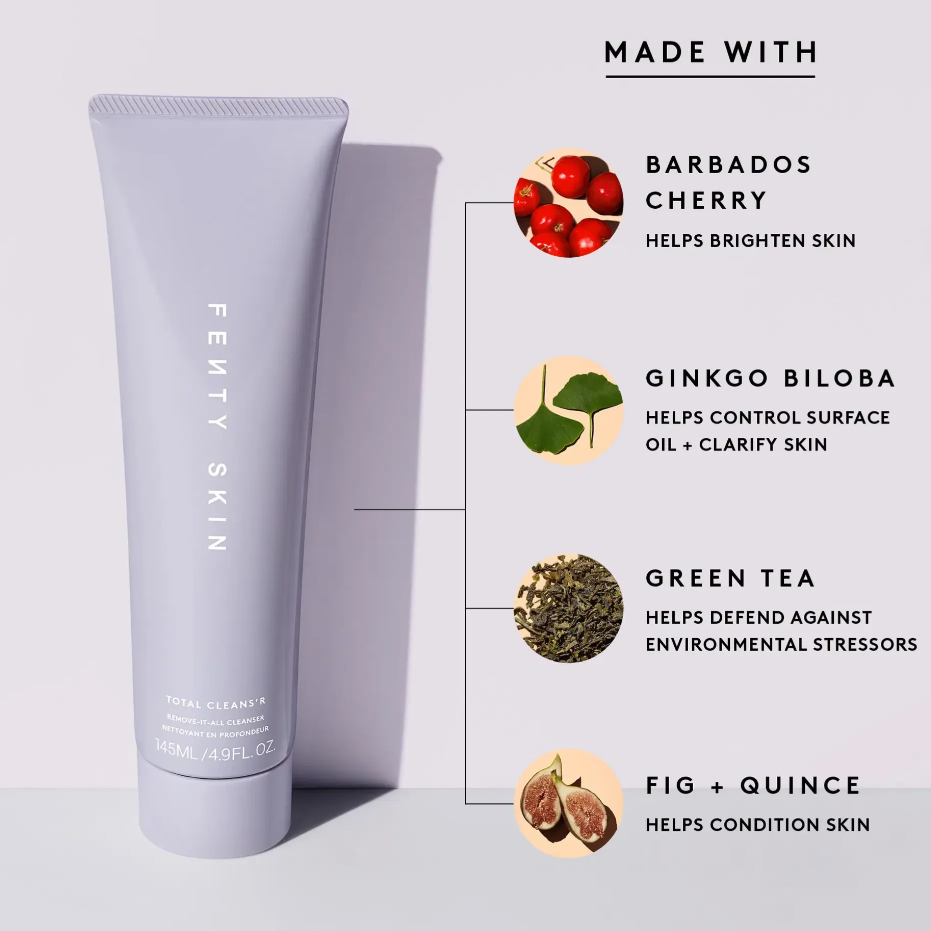Kermainen puhdistusvoide, joka poistaa tehokkaasti lian, öljyn ja epäpuhtaudet ättämättä ihoa kuivaksi tai kireän tuntuiseksi. Ginkgo Biloba auttaa tasapainottamaan ihohuokosia ja vähentää kiiltoa. Antioksidanttirikas Barbadoksen kirsikka auttaa elvyttämään ihoa ja kvittenihedelmä sekä kookos raikastavat ihoa. Ei-komedogeeninen. Herkullinen kirsikan ja kookoksen tuoksu virkistä aisteja. Sopii kaikille ihotyypeille. Vegaaninen.