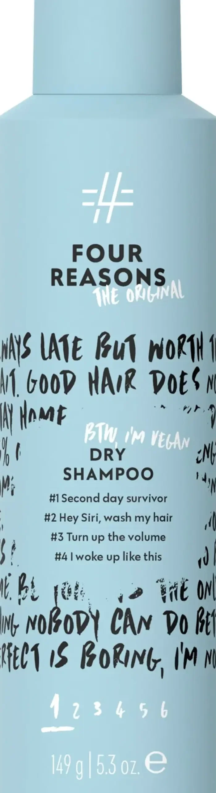 Four Reasons Original -kuivashampoo raikastaa hiukset pesujen välillä: riisitärkkelys hillitsee hiuspohjan rasvaisuutta ja jättää hiukset puhtaan tuntuiseksi. Antaa kevyttä, samettista tukea. Sopii kaiken värisille hiuksille. Vinkki: Rankimmankin aamun pelastavat kuppi kahvia ja hyvä kuivashampoo.