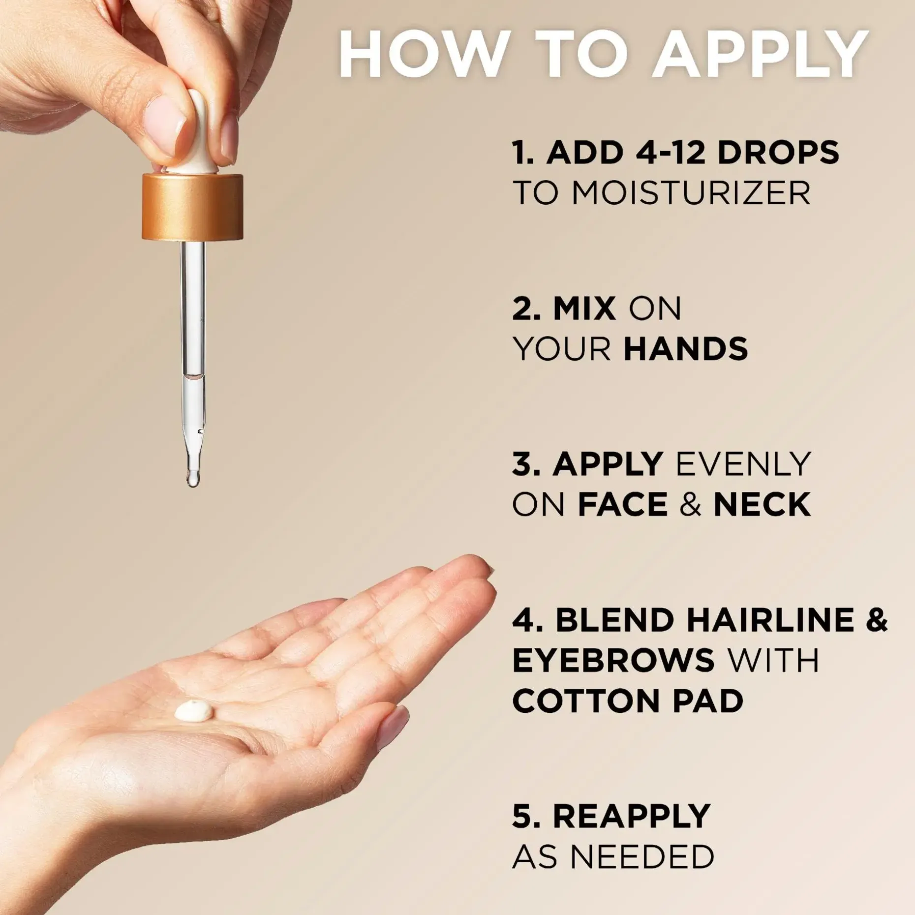 Blanda 4-12 droppar med en ansiktskräm från Garnier*. Applicera jämnt på ren hud i ansiktet och på halsen. Undvik ögonområdet. Tona noggrant ut vid hårfäste och ögonbryn med en bomullspad. Skyddar inte huden mot UV-strålar. Justera antalet droppar efter önskad intensitet. Fler antal droppar ger en mörkare effekt.