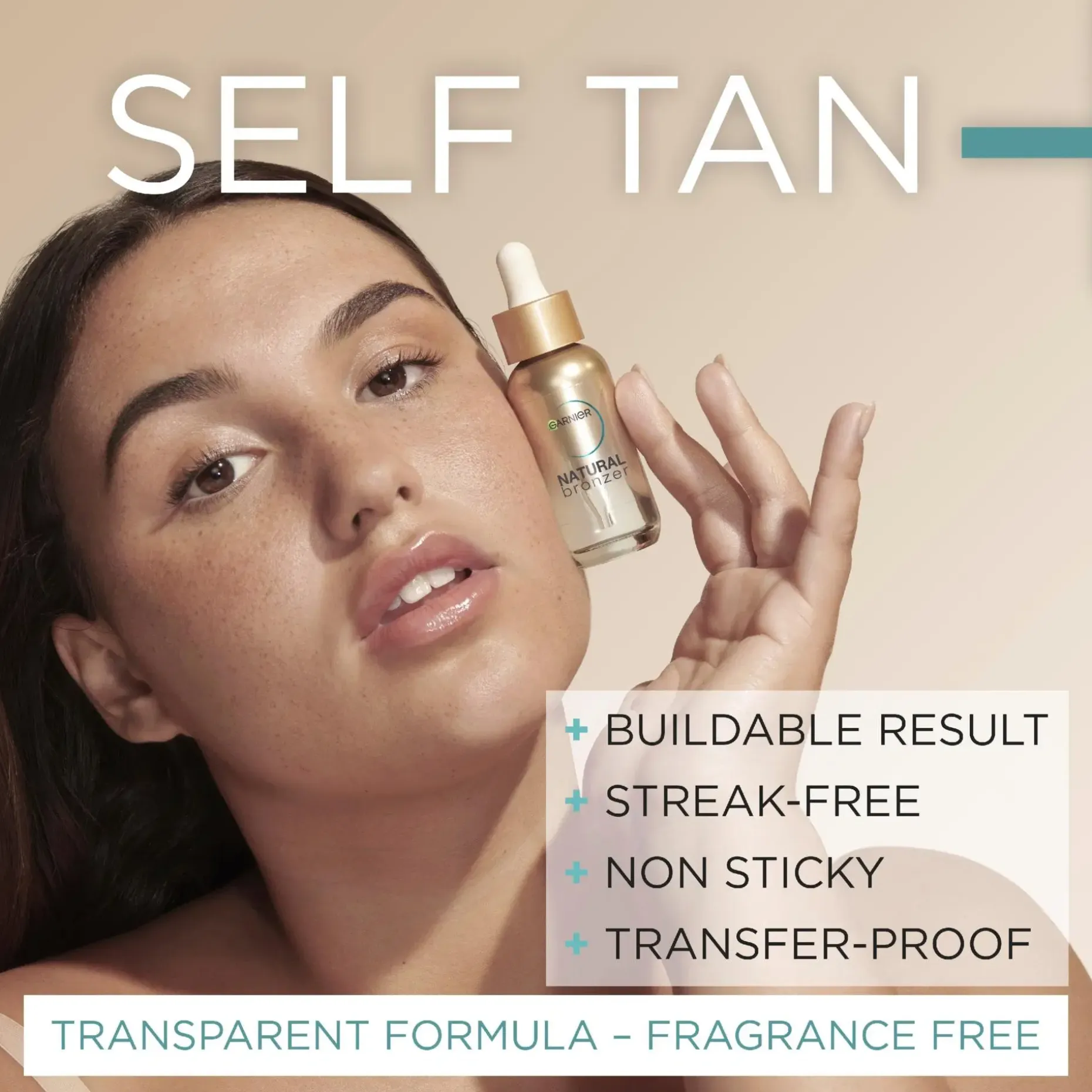 Helppo päivetys kasvoille koko vuoden ajan! Garnier Ambre Solaire Natural Bronzer Self Tan Face Drops itseruskettavat tipat kasvoille antavat iholle asteittain luonnolliselta näyttävän päivetyksen vain muutamalla tipalla. Koostumus sisältää hyaluronihappoa ja kosteuttavaa kookosvettä. Ihosi tuntuu välittömästi kosteutetulta ja pehmeämmältä ja saa asteittain päivettyneen sävyn ilman altistumista auringon säteille. Päivästä toiseen* iho saa kaunista auringonhehkua ja heleyttä, joka näyttää luonnolliselta. Koostumus sisältää kasviperäisiä vaikuttavia ainesosia ja on vegaaninen**. Natural Bronzer Self Tan Face Drops itseruskettavat tipat kasvoille on välttämätön lisä ihonhoitorutiiniisi.