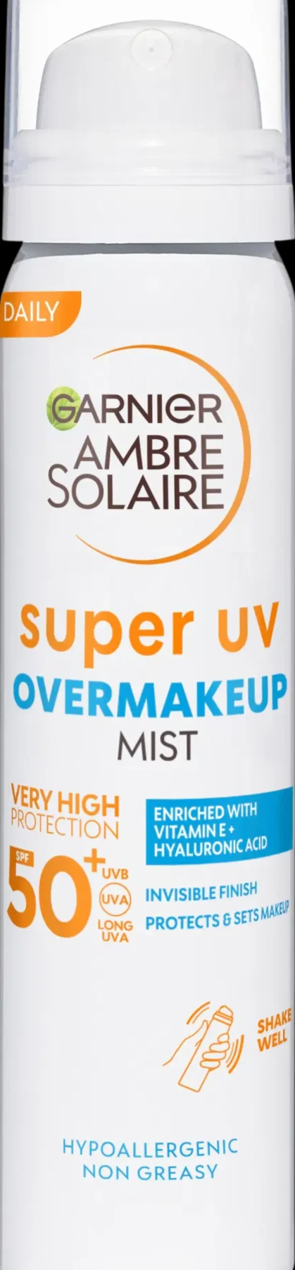 Garnier Ambre Solaire Super UV Over Makeup -aurinkosuojasuihkeella SPF50+ on kevyt koostumus ja sitä voidaan käyttää sekä meikin alla että päällä. Herkälle kasvojen iholle kehitetty koostumus sisältää hyaluronihappoa.