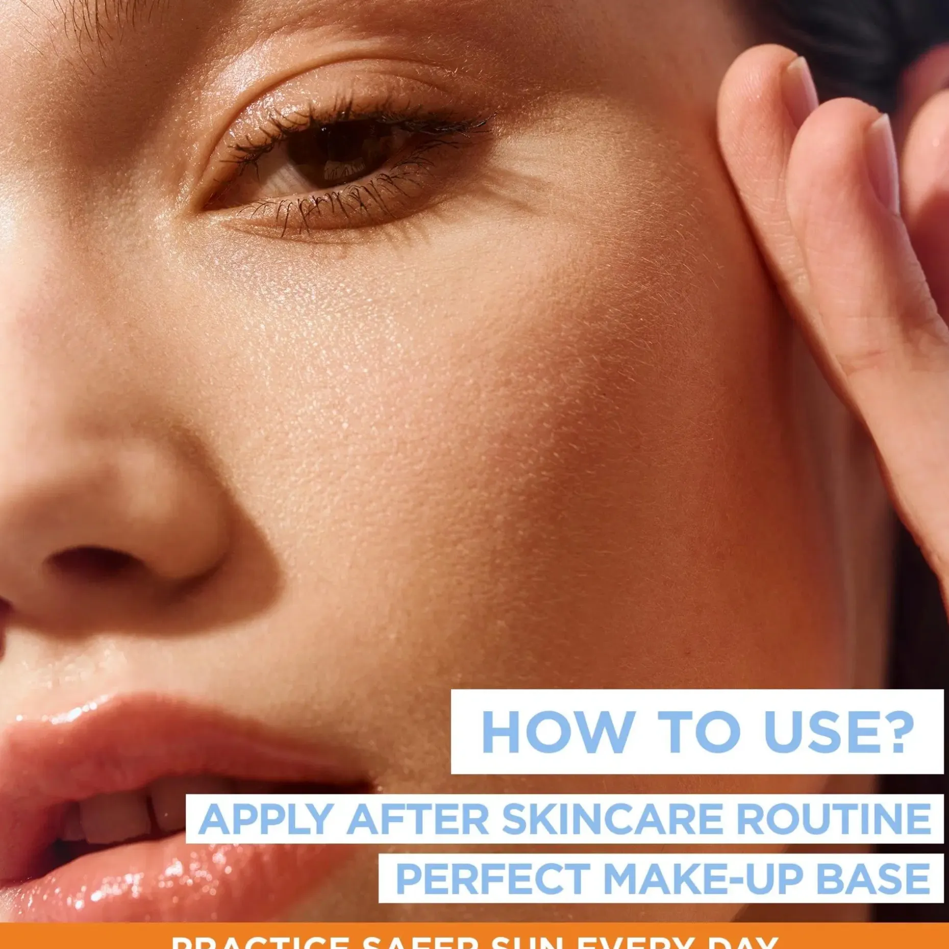 Ravista hyvin. Käytä aurinkosuojavoidetta päivittäin ihonhoitorutiinisi viimeisenä askeleena. Levitä tuotetta usein ja runsaasti, vähintään kämmenellinen, suojatehon säilyttämiseksi, erityisesti uimisen, hikoilun tai kuivaamisen jälkeen. Vältä silmänympärysaluetta.