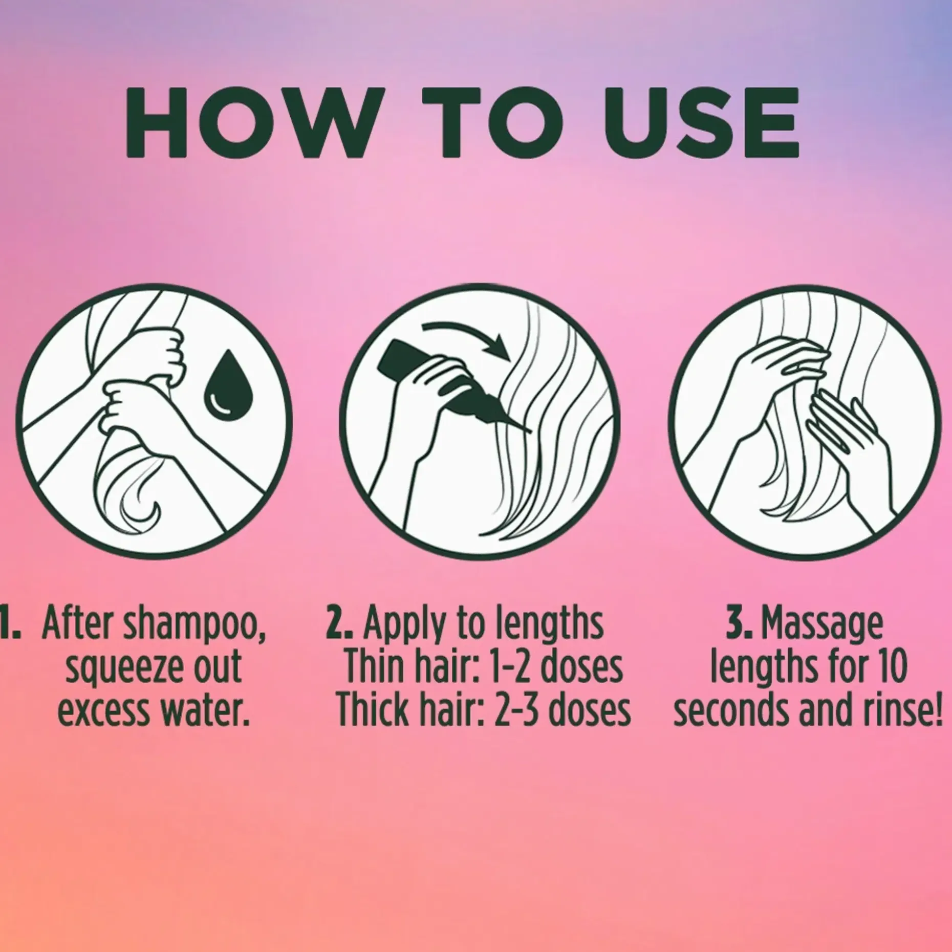 STEG 2: Applicera produkten direkt i längderna. Har du fint hår? Använd 1 dosering. Tjockare hår? Använd 2 eller 3 doseringar.