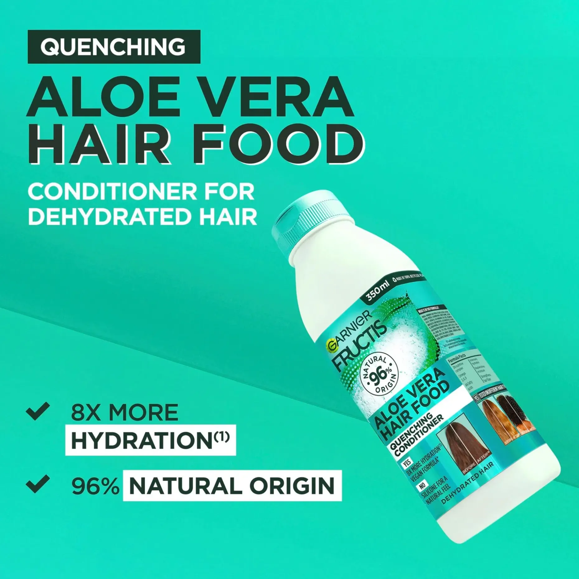 Garnier Fructis Hair Food Aloe Vera Quenching -hoitoaine kosteuttaa ja vahvistaa hiuksia ja jättää hiukset 8X kosteutetuimmiksi*. Vegaaninen koostumus** ei sisällä silikonia luonnollisen tunteen aikaansaamiseksi ja se sisältää omega 3,6, ja 9 sekä 4% rasvahappoja. • 8x kosteutetummat hiukset* • Intensiivisesti kosteuttava • Vahvistaa hiuksia • Vegaaninen koostumus** • 97% luonnollista alkuperää oleva koostumus on 98% biohajoava*** • Garnier on virallisesti hyväksytty Cruelty Free International Leaping Bunny -ohjelmaan. • Kierrätettävä pullo on valmistettu 100% kierrätetystä muovista****. *Mittaustulos käytettäessä shampoota + hoitoainetta ** Ei sisällä eläinperäisiä ainesosia ***OECD 301 tai vastaavien testien mukaisesti ****Lukuun ottamatta korkkia ja väri- ja lisäaineita