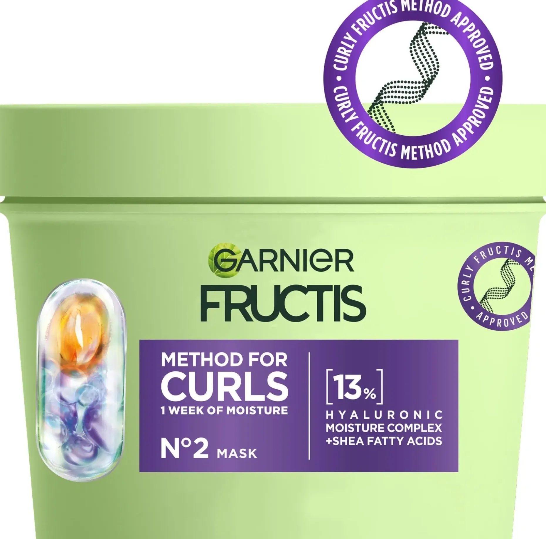 Garnier Fructis Method for Curls -hiusnaamio on kehitetty hemmottelemaan kiharia hiuksia. Method for Curls -hiustenhoitorutiinin vaihe N°2 kosteuttaa kihariasi viikon ajan*. Koostumus sisältää 13% kosteuttavien ainesosien yhdistelmää, joka sisältää hyaluronihappoa ja rasvahappoja karitevoista. Testattu eri tyyppisillä kiharoilla, Fructis Method for Curls -menetelmän hyväksymä. Täydennä rutiinisi Fructis Method for Curls N°0 kosteuttavalla ennen pesua käytettävällä käsittelyllä , N°1 hellävaraisesti pesevällä shampoolla ja N°3 kosteuttavalla suihkeella.