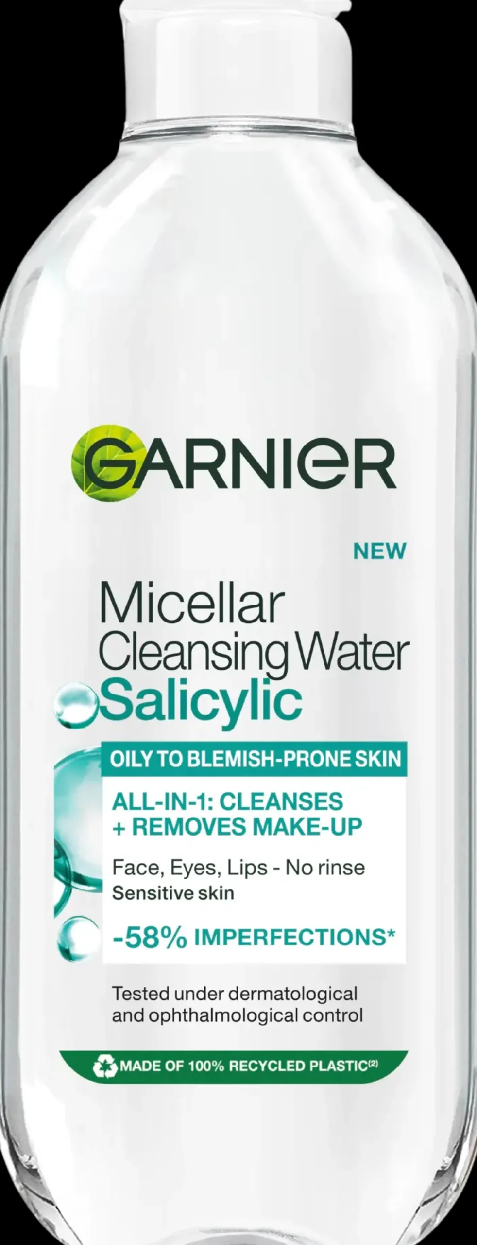 Garnier Micellar Cleansing Water Salicylic puhdistusvesi sopii erityisesti rasvoittuvalle ja epäpuhtauksiin taipuvaiselle iholle, jopa herkälle iholle. Puhdistusvesi poistaa lian, meikin ja ilmansaasteiden hiukkaset ja vähentää ihon epäpuhtauksia* samalla kun se ja jättää ihon mattapintaiseksi. Ei jätä näkyviä tuotejäämiä iholle**. • Puhdistaa ihon, poistaa meikin ja vähentää ihon epäpuhtauksia* • Koostumus sisältää salisyylihappoa • Rasvoittuvalle, epäpuhtauksiin taipuvaiselle iholle • Jättää ihon mattapintaiseksi • Testattu ihotautilääkärin ja silmälääkärin valvonnassa • Vegaaninen koostumus** • Pullo on valmistettu 100 % kierrätetystä muovista**** *Kosmeettis-kliininen testi, 4 viikkoa, 45 henkilöä *Kuluttajatutkimus, 140 henkilöä *Ei sisällä eläinperäisiä ainesosia ***Lukuun ottamatta väri- ja lisäaineita ja etikettiä