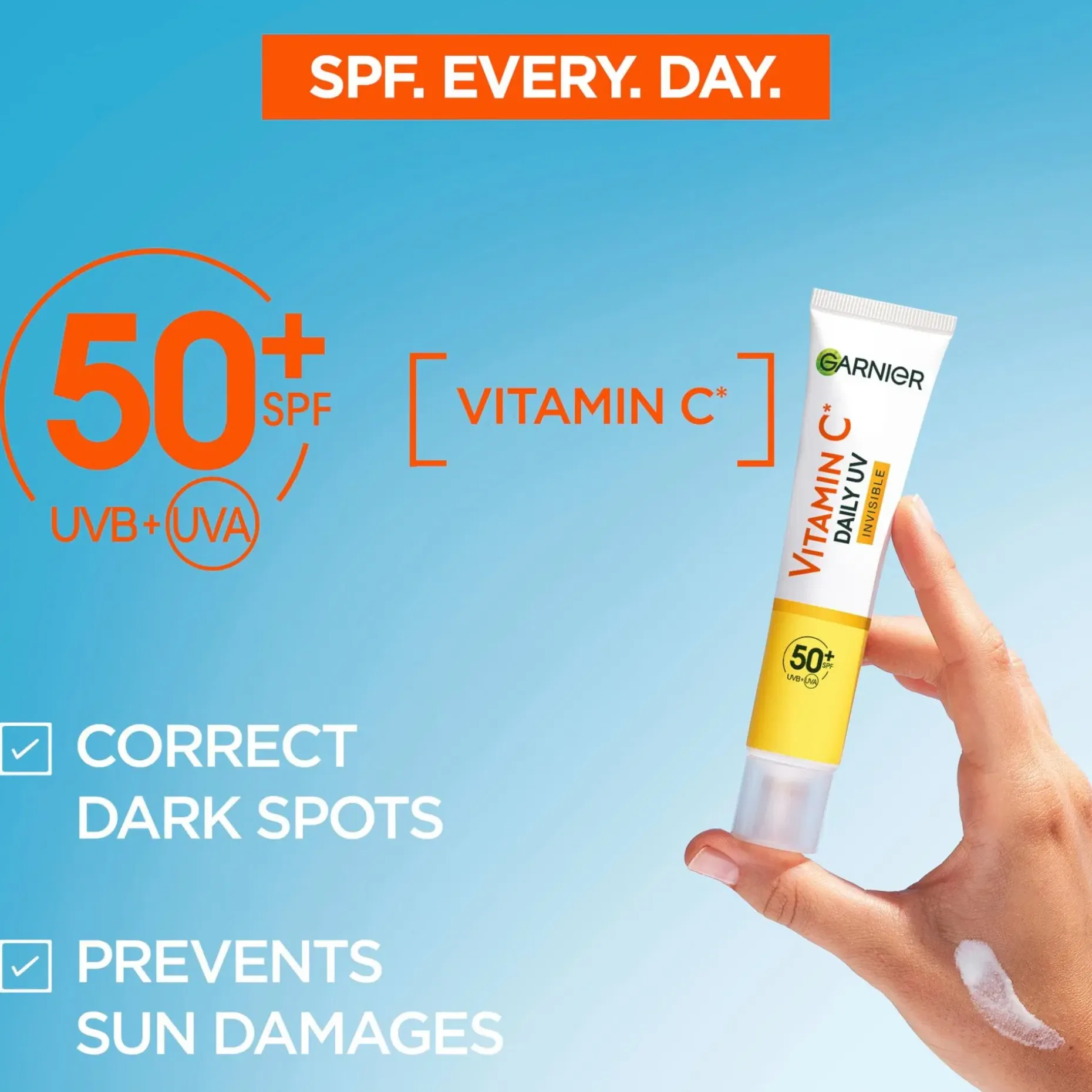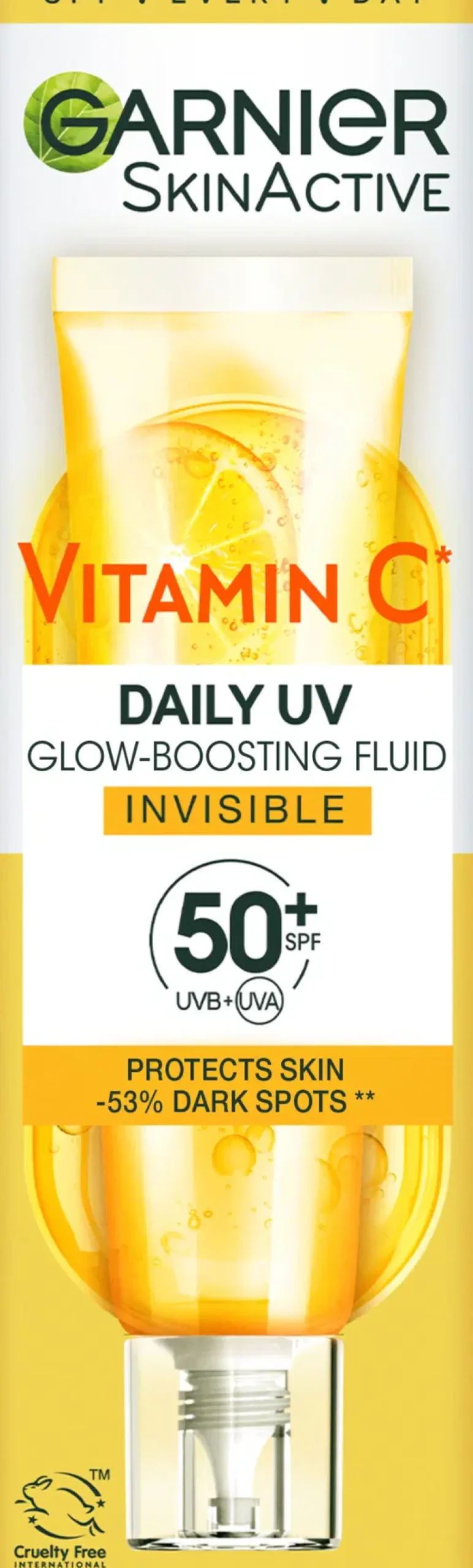 Vitamin C* Daily UV Fluid Invisible on koostumus kasvoille päivittäiseen käyttöön, erittäin korkealla aurinkosuojalla SPF50+. Kevyt, nestemäinen koostumus sisältää [C-VITAMIINIA*] +[PEPTIDEJÄ] + [HYALURONIHAPPOA] kosteuttamaan ihoa koko päivän samalla kun se antaa suojaa UVB-, UVA- ja pitkiä UVA-säteitä vastaan ja auttaa tummien läiskien muodostumista vastaan. Ei jätä iholle tahmaista tai rasvaista tunnetta. 12 viikon jälkeen**: 53 % vähemmän tummia läiskiä, 43 % enemmän hehkua, 40 % tasaisempi iho. Koostumus ei tuki ihohuokosia, sopii herkälle iholle. Testattu ihotautilääkärin ja silmälääkärin valvonnassa. Näkymätön lopputulos kaikilla ihotyypeillä ja ihon sävyillä. • Koostumus sisältää [C-VITAMIINIA*] + [PEPTIDEJÄ] + [HYALURONIHAPPOA] • Taistelee kaikenlaisia tummia läiskiä vastaan • 53% vähemmän tummia läiskiä, 43% enemmän hehkua, 40% tasaisempi iho** • Ei tuki ihohuokosia • Sopii herkälle iholle • Testattu ihotautilääkärin ja silmälääkärin valvonnassa • Näkymätön lopputulos kaikilla ihotyypeillä ja ihon sävyillä *C-vitamiini = C-vitamiinin johdannainen **Kosmeettis-kliininen tutkimus, 76 henkilöä, 12 viikkoa, vaikutus tummen läiskien intensiteettiin ja näkyvyyteen. Keskiarvo, tulokset voivat vaihdella.