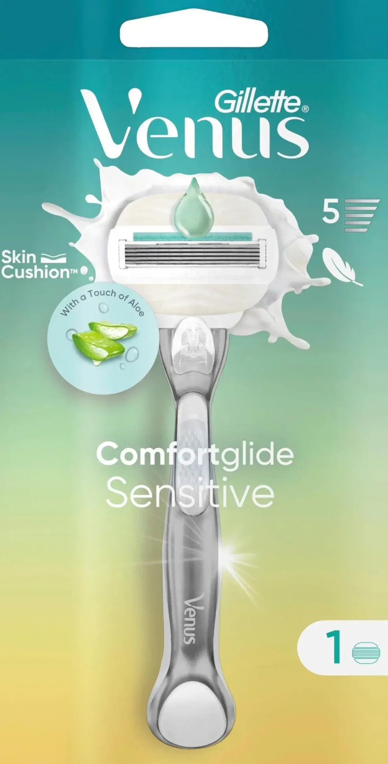 Naisten Venus ComfortGlide Sensitive -höylän viisi terää antavat ihonmyötäisen ajon. Näissä vaihtoterissä on Olay-kosteustyynyt, joista vapautuu kevyt aloe veran tuoksuinen vartalovoi. Joustavat geelityynyt mukautuvat vartalon muotoihin. Kaikki Venus-vaihtoterät sopivat kaikkiin Venus-höyliin (poikkeuksena Simply Venus ja häpyalueelle tarkoitettu Venus-höylä).