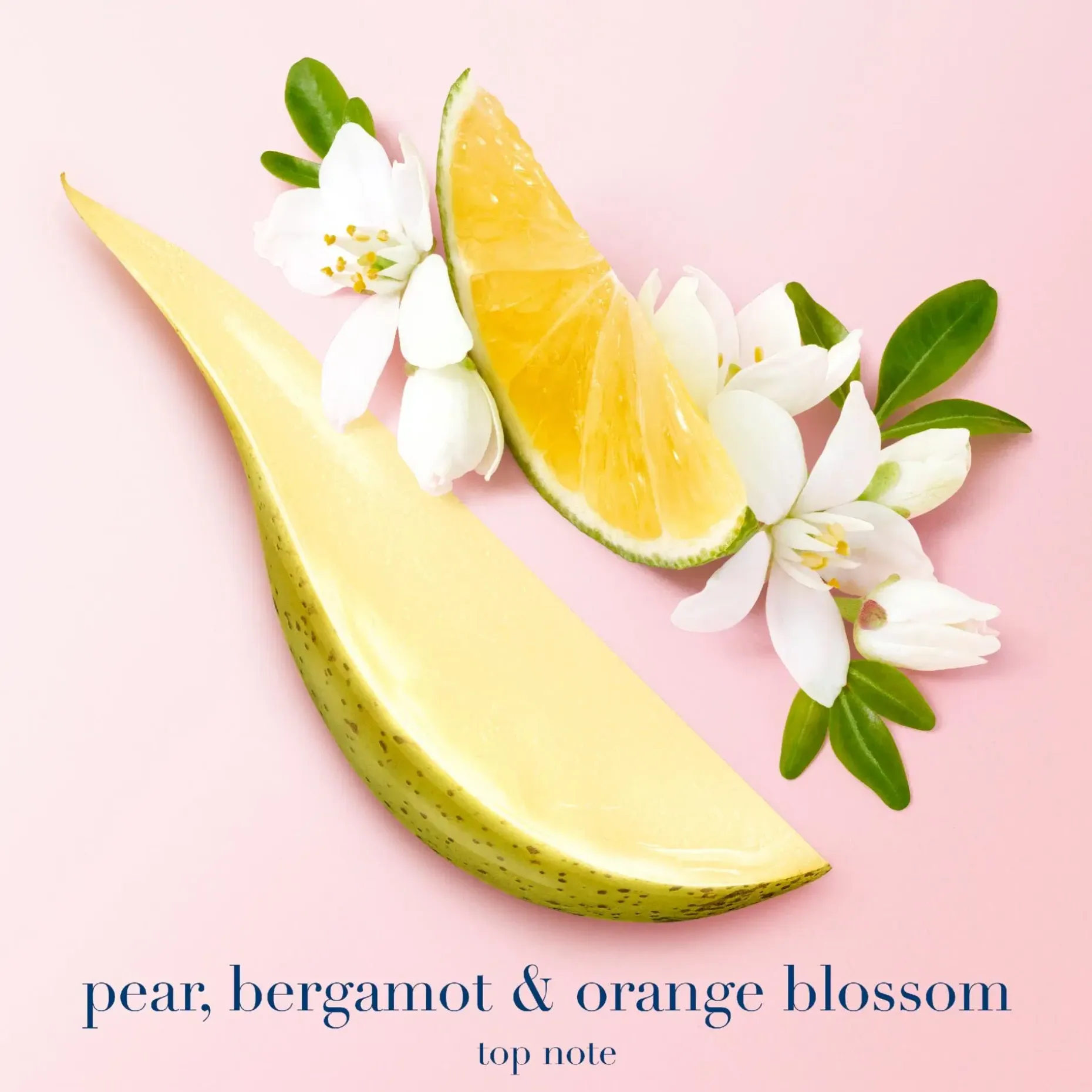 Alkutuoksussa on raikkautta, mehukasta päärynää ja eloisan aromaattista raparperia. Hedelmäiset sävyt sulautuvat pirteän bergamotin sydäntuoksun ja kiehtovan appelsiininkukan kanssa ja luovat intensiivisen ja virkistävän sekoituksen.