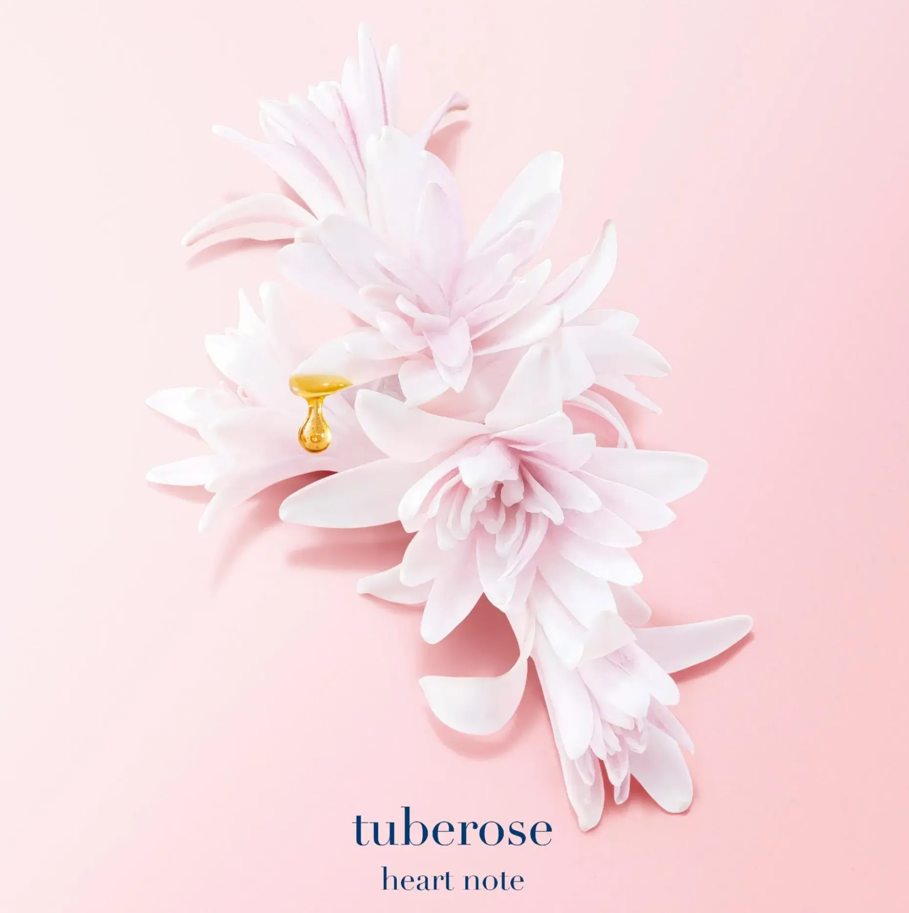 Sydäntuoksussa on valkoinen kukkakimppu, josta paljastuu tuberosa-absoluutin täyteläisyys.