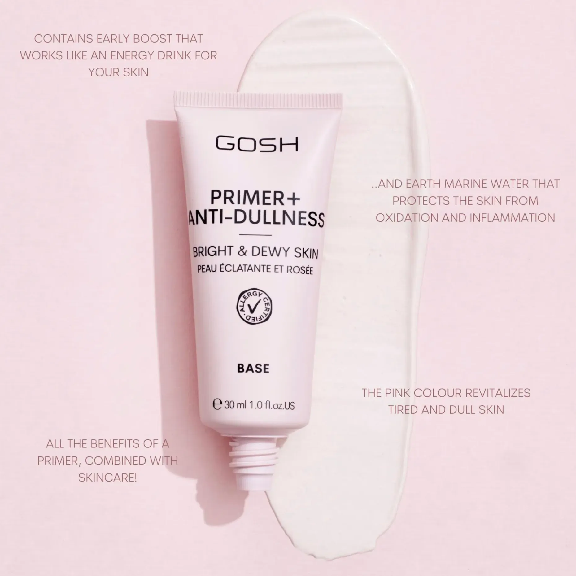 GOSH Primer Plus+ Anti-Dullness -meikinpohjustaja luo meikille tasaisen pohjan ja lisää meikin kestävyyttä. Ihon pinta näyttää aiempaa sileämmältä ja tasaisemmalta ja meikkivoiteen levittäminen helpottuu. Antaa iholle kauniin hehkuvan lopputuloksen.