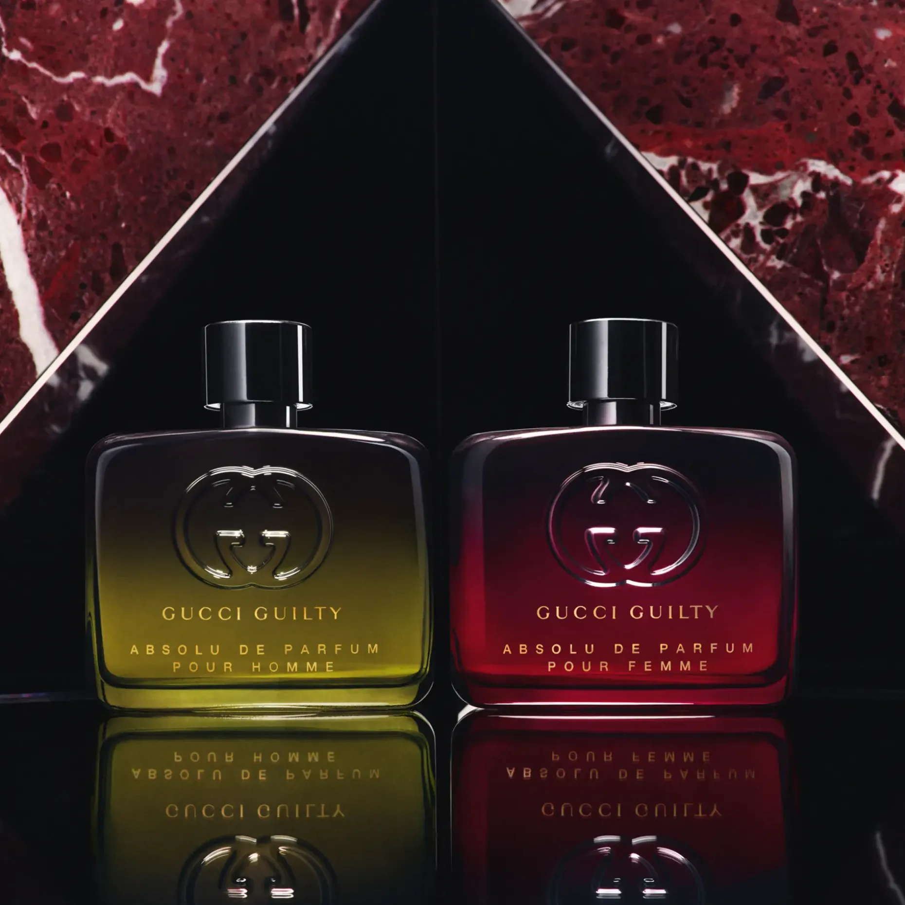 Jokaisella nautinnolla on oma tuoksunsa, mikä on sinun? Gucci Guilty Absolu de Parfum Pour Homme ja Pour Femme ovat harvinaisten vuosikertojen duo. Gucci Guilty Absolu de Parfum Pour Femme on intensiivinen, kukkaisen pihkainen tuoksu, joka on luotu nautinnon tuottajaksi. Sen sydämessä tumma Amaretto kahvin uute tuo esiin poltetun aromin, joka muistuttaa kahvipohjaisen sekoituksen samettista makua. Hellästi sekoitettuna tonkapavun kanssa se luo ylellisen ja vangitsevan koostumuksen, joka kontrastoi Wisteria Accord -tuoksun makeuden kanssa. Lopputuloksena on naisille tehty tuoksu, joka kestää tuntikausia – ripaus hienostuneisuutta, aistillisuutta ja mysteeriä, joka sopii täydellisesti mihin tahansa tilaisuuteen, erityisesti illanviettoon hämärässä, intiimissä tilassa. Syvän punainen pullo paljastaa ehdottomasti Guilty -tuoksun, joka on luotu vahvalle, itsevarmalle ja sensuellille naiselle, joka antaa periksi kiusauksille.