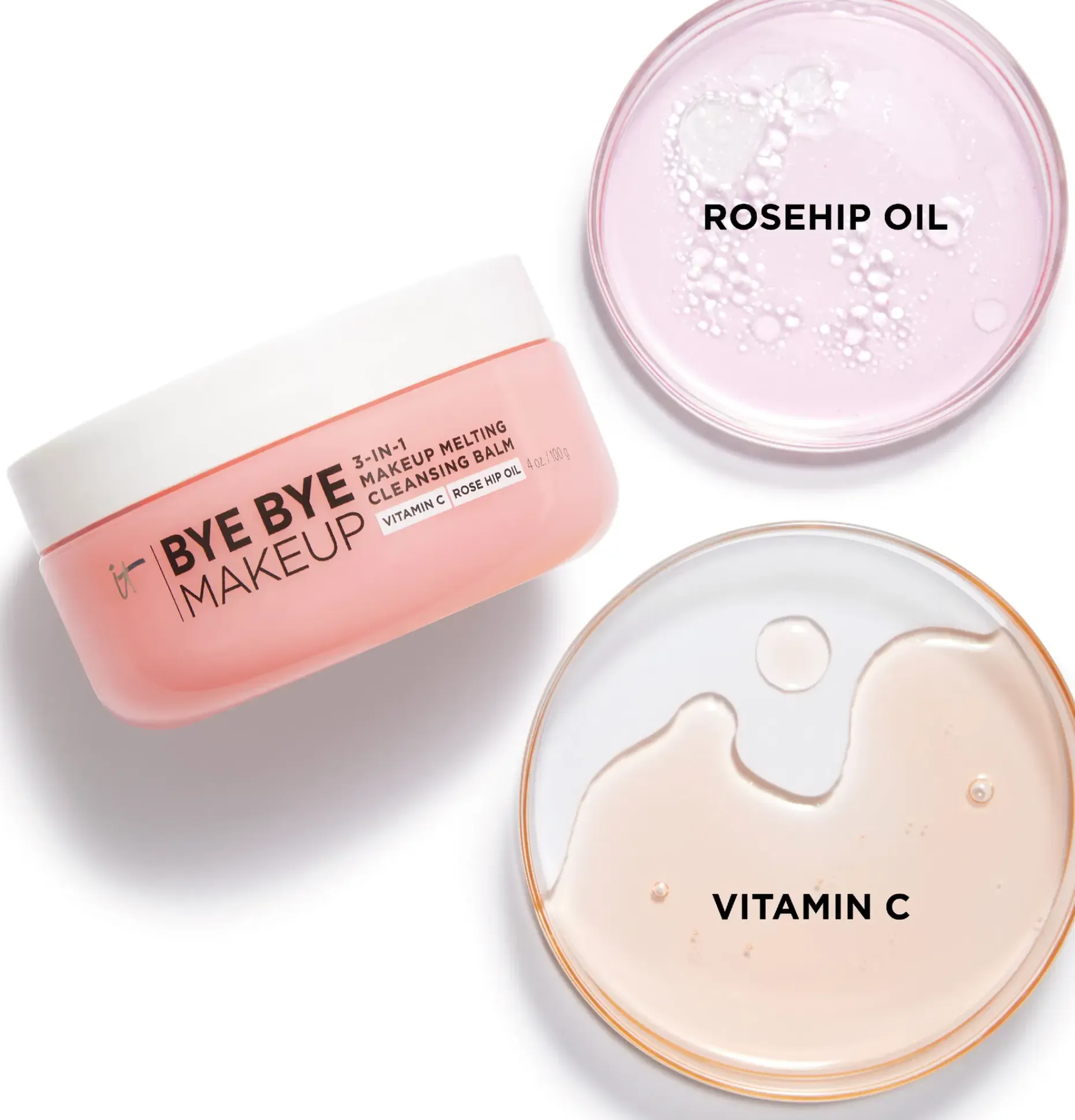 ”BYE BYE” meikille ja tervetuloa kosteutetulle iholle! Bye Bye Makeup 3-in-1 Makeup Melting Cleansing Balm on monitoiminen ja kosteuttava meikinpoistoaine, joka sisältää nyt entistä enemmän hyviä ominaisuuksia. Se on vedenkestävän meikkisi ja aurinkosuojavoiteesi poistava puhdistustuote, kirkastava puhdistustuote ja erittäin kosteuttava kasvonaamio yhdessä tuotteessa. Se poistaa helposti vedenkestävän meikin, aurinkosuojavoiteen, lian, öljyn ja epäpuhtaudet – kuivattamatta ihoa! Ei-komedogeeninen, alkoholiton, vegaaninen* ja silmälääkärien testaama koostumus sopii kaikille ihotyypeille, myös herkälle iholle. Koostumuksen ihoa hellivät ainesosat, kuten C-vitamiini ja ruusunmarjaöljy, kosteuttavat ja kirkastavat ihoa välittömästi ja pitkäkestoisesti. *Vegaaninen koostumus: ei eläinperäisiä ainesosia. Plastiikkakirurgien ja ihotautilääkäreiden kokemuksiin ja asiantuntemukseen perustuva IT Cosmetics luo tuotteita, joiden koostumukset hoitavat ihoa, rakaisevat iho-ongelmia ja antavat todellisia tuloksia.